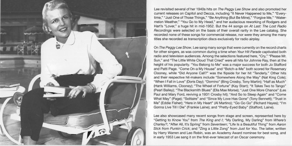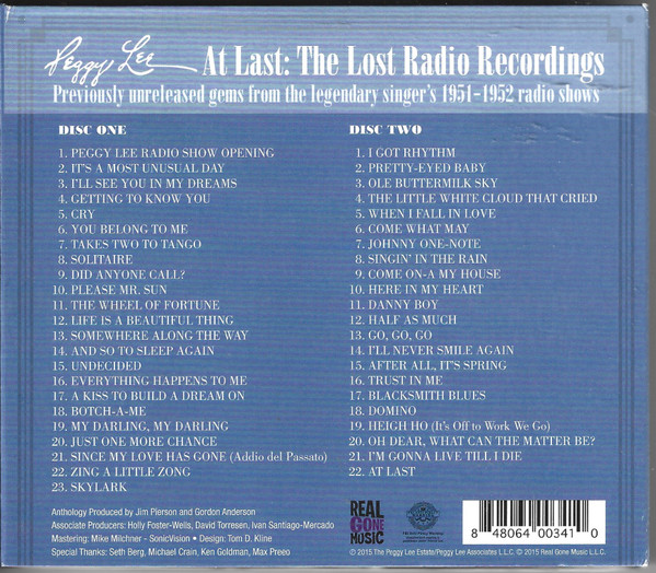 В двухдисковой антологии Пегги Ли "At Last: The Lost Radio Recordings" 2015 года собраны живые выступления культовой вокалистки для ее радио-шоу в 1951 году. Первоначально транслировавшиеся по каналу CBS и радиослужбе Вооруженных сил, эти выступления демонстрируют выступление Ли при поддержке групп под руководством Сонни Берка в Лос-Анджелесе и Расса Кейса в Нью-Йорке. Вместо того чтобы сосредоточиться на своем самом известном материале, Real Gone подобрала песни, которые Ли официально никогда не записывала в студии, в том числе многие песни, ставшие известными благодаря ее современницам, таким как Дорис Дэй, Розмари Клуни, Дайна Шор и Джо Стаффорд. В альбом вошли такие песни, как "Я увижу тебя в своих снах", "Колесо фортуны", "Со мной все случается", "Оле Баттермилк Скай", "Я больше никогда не буду улыбаться" и многие другие. (Автоматический перевод)