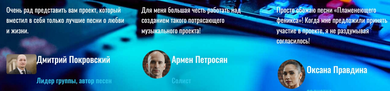 Группа «Пламенеющий феникс» — это не только эксклюзивные авторские песни Дмитрия Покровского, но еще и живые приглашенные исполнители, профессиональные музыканты, а также использование искусственного интеллекта при создании песен, что в разы ускоряет процесс музыкального производства. РФ, Тульская область, г.Алексин