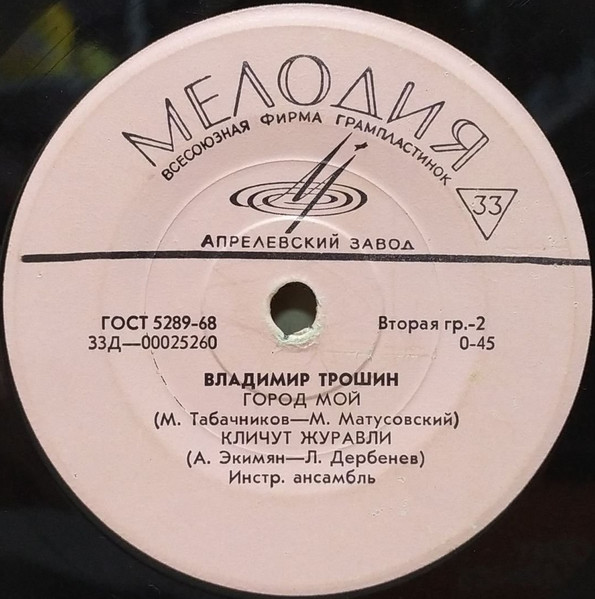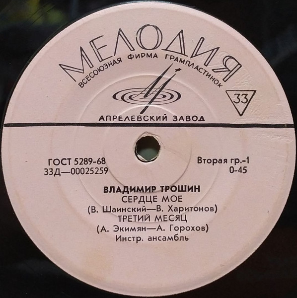 Сердце моё(В.Шаинский-В.Харитонов) Третий месяц(А.Экимян-А.Горохов) Город мой (М.Табачников-М.Матусовский) Кличут журавли(А.Экимян-Л.Дербенев) ГОСТ 5289-68 33Д-00025259 -вторая гр.-1 33Д-00025260-вторая гр.-2 Апрелевский завод моно 33