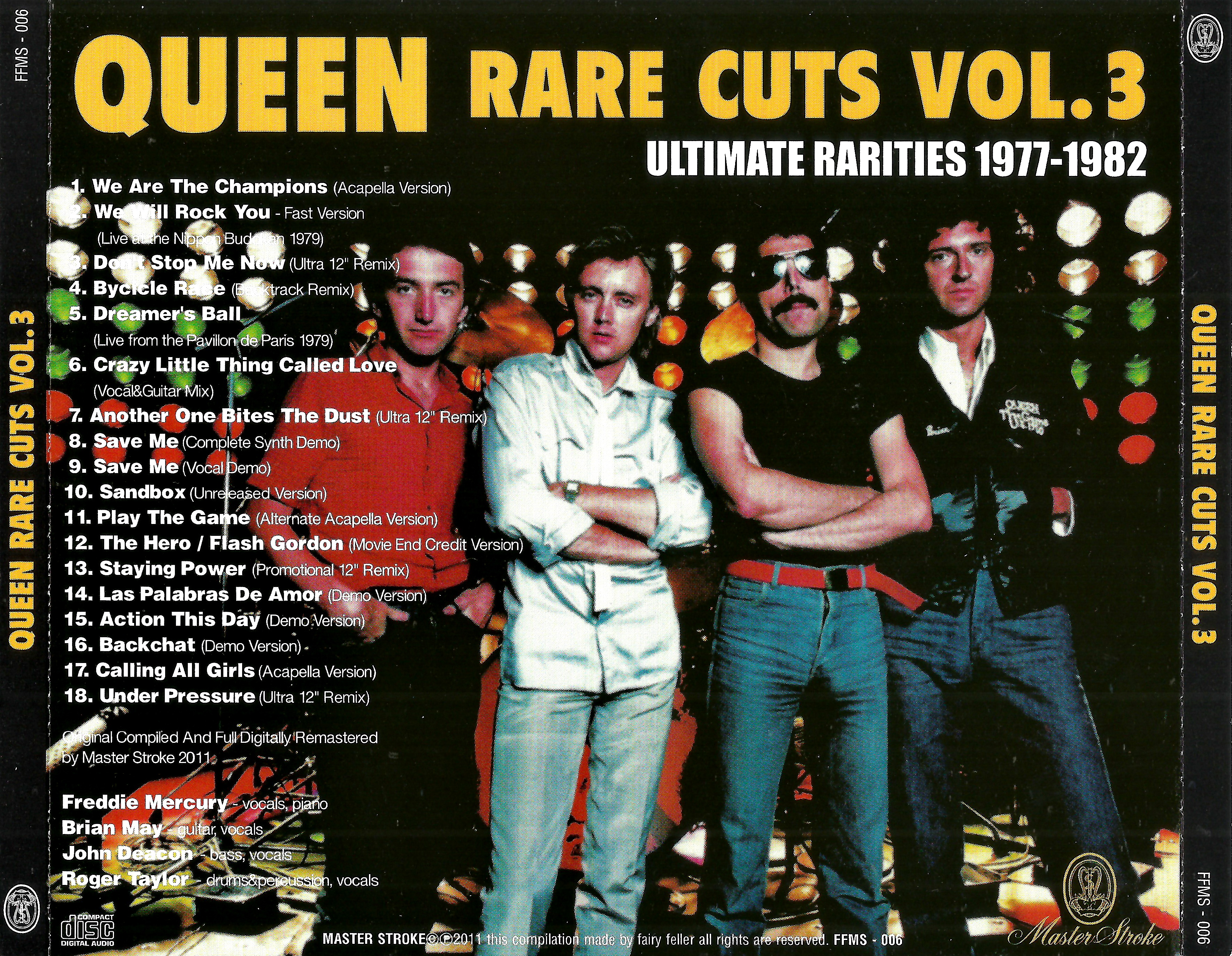 Коллекция редких треков, относящихся к периоду творчества Queen с 1977 по 1982 год! Третий том начинается с исполнения "We Are the Champions" а капелла. В отличие от инструментальной версии в конце VOL.2, эта версия, содержащая только вокал Фредди и припев, является треком, который обязательно нужно прослушать и который поразит вас своим мощным голосом. "We Will Rock You" и "Dreamer's Ball" - это концертные записи, которые еще не были выпущены. Знакомые синглы "Crazy Little Thing Called Love", "Save Me" и "Play the Game" - это простые демо-версии или треки с обнаженным вокалом, а свежие версии полны очарования, потому что они незаконченные. "Don't Stop Me Now", "Another One Bites the Dust" и "Under Pressure" включены в 12-дюймовую версию Ultratrack, ремикс, который отдает больше уважения оригиналу, чем печально известный голливудский ремикс. "Sandbox" - это неизданная изюминка, и здесь она представлена в своей лучшей версии без закадрового голоса, который был показан, когда она впервые была представлена на конференции. Также можно услышать редкие неизданные версии "Bicycle Race" и "The Hero & Flash Gordon", а также очень интересные демозаписи с альбома "Hot Space".