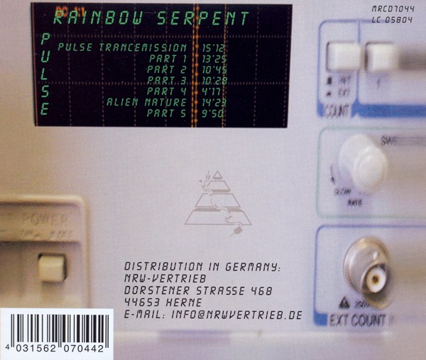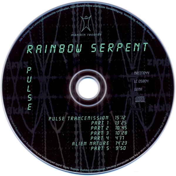 Rainbow Serpent – Pulse Label: Manikin Records – MRCD 7044 Format: CD, Album Country: Germany Released: 2000 Genre: Electronic Style: Berlin-School 1. Pulse Trancemission (15:12) 2. Part 1 (13:25) 3. Part 2 (10:45) 4. Part 3 (10:28) 5. Part 4 (4:17) 6. Alien Nature (14:23) 7. Part 5 (9:50) Total Time 78:20 Вся музыка написана, сыграна и записана группой Rainbow Serpent в 2000 году Радужный Змей — это Герд Винекамп и Франк Шпехт Фотографии Герд Винекамп Дизайн обложки Килиана Шлемпа