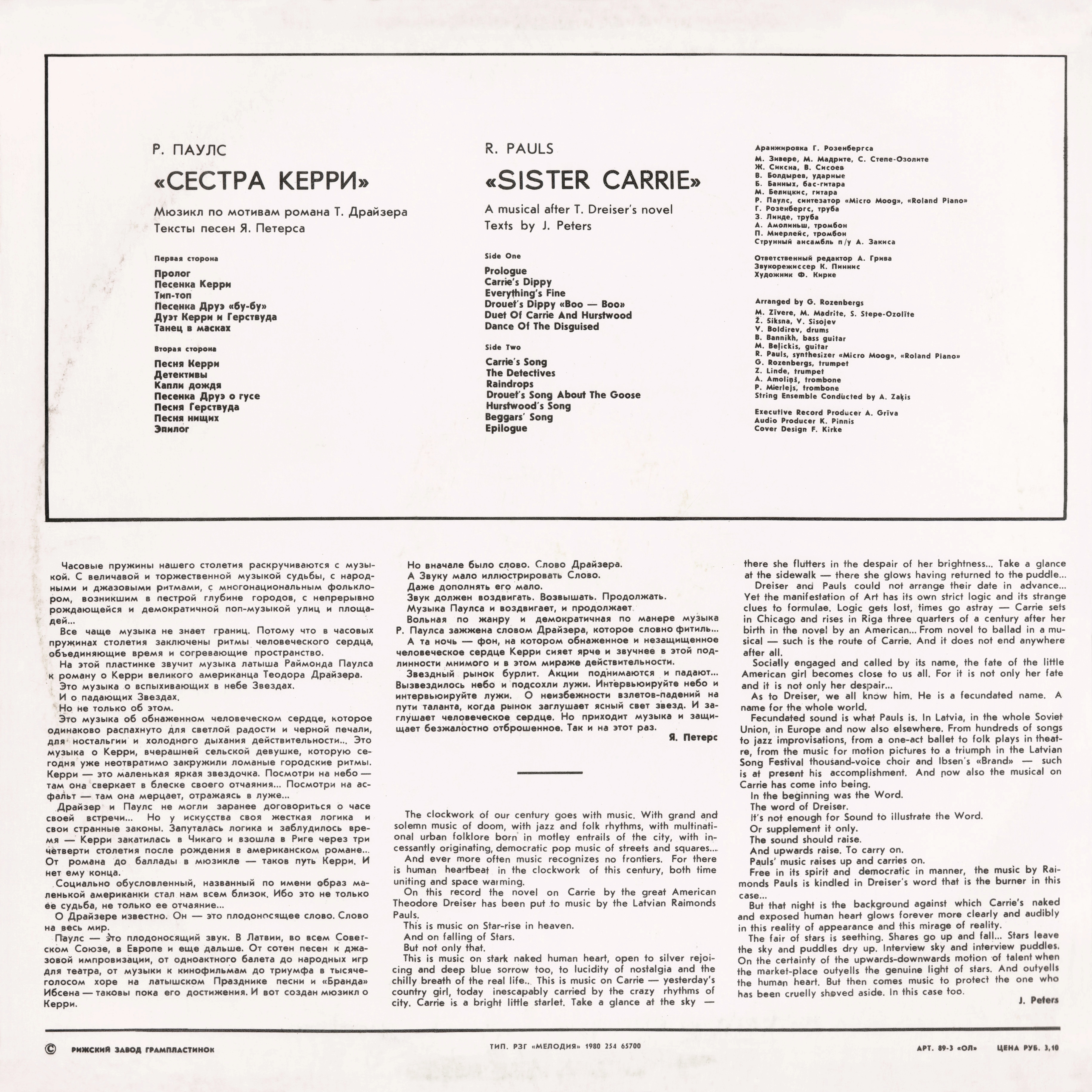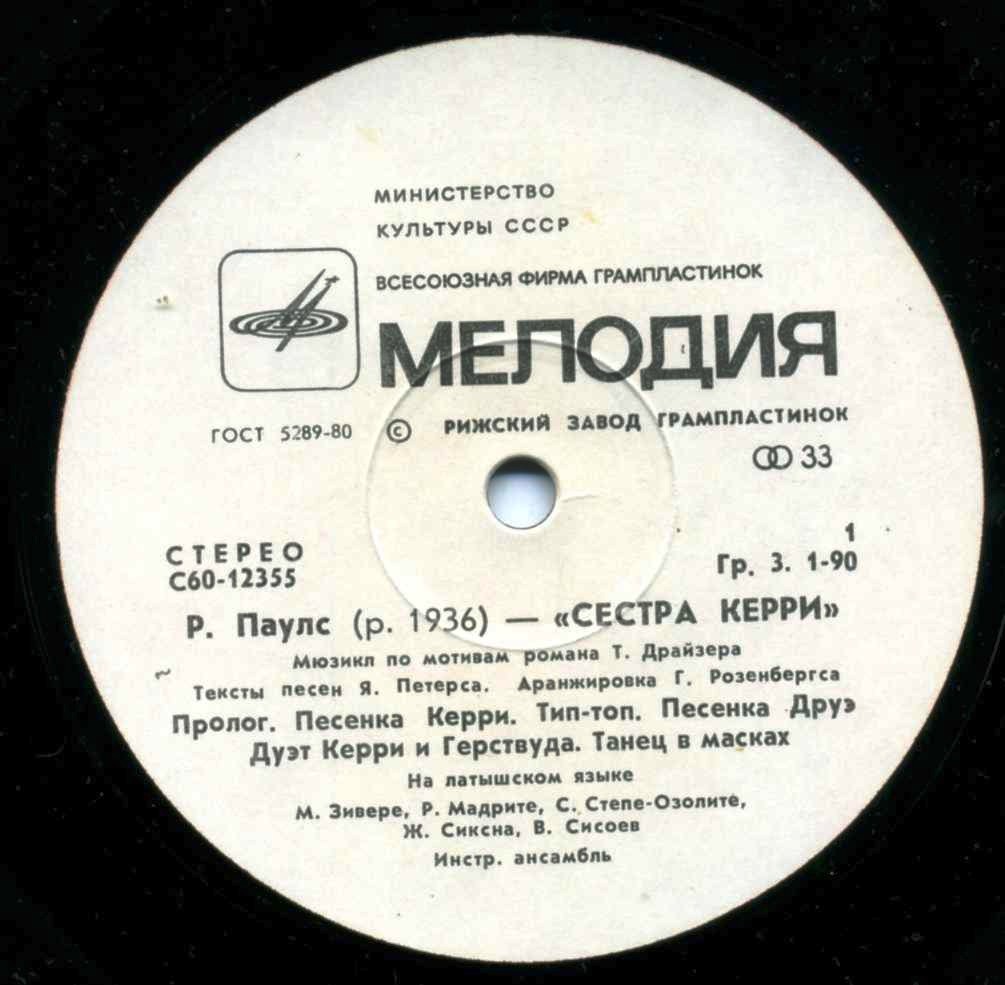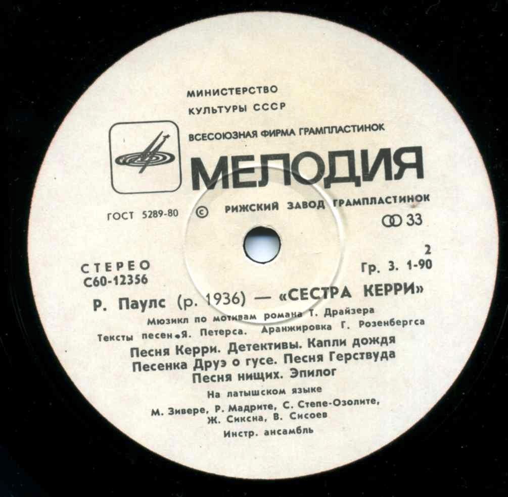 На этой пластинке звучит музыка латыша Раймонда Паулса к роману о Керри великого американца Теодора Драйзера.