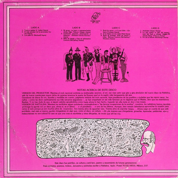 Перед вами двойной альбом мексиканской группы Naftalina - разностороннего музыкального коллектива, состоящего из исполнителей с большим опытом работы на отечественной сцене. Некоторые его участники работали вместе с 60-х годов в группе Los Sonámbulos, выпустившей всего один LP (1960) и несколько синглов, но считавшейся в то время одной из лучших рок-н-ролльных формаций страны.
