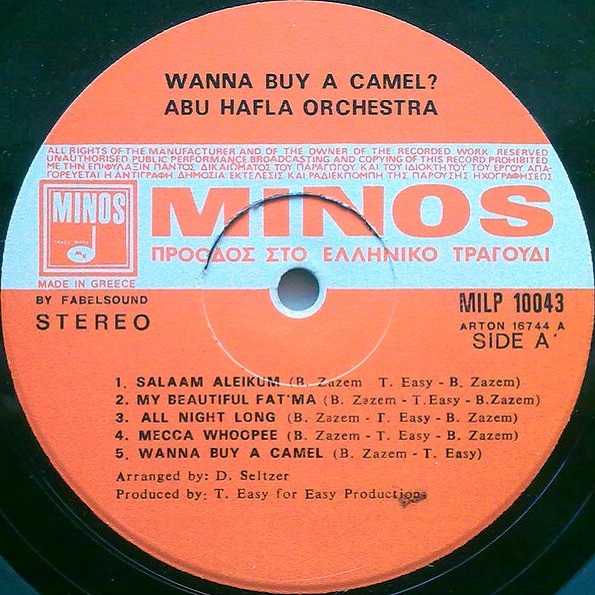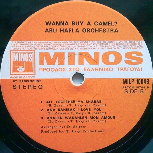 Исполнитель при записи пластинки - Abu Hafla Orchestra, а вернее, группа, известная ещё как просто Abu Hafla, по-видимому, тоже сборная - грекоизраилетурецкая, если можно так выразиться. Под этим названием в 1977-м и 1978 годах они выпустили ещё пару синглов с композициями, вошедшими в единственный LP.