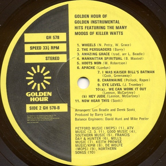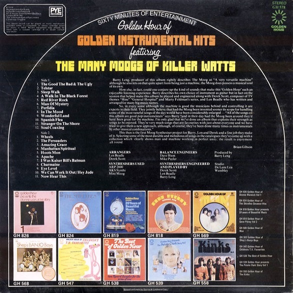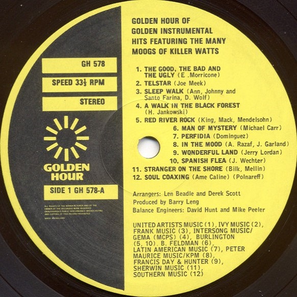 Не поймите меня превратно, но столь пространный опус предварял знакомство с, разумеется, редким альбомом 1974 года бюджетного лейбла «Golden Hour», содержащим «Золотые инструментальные хиты» в исполнении ансамбля сессионных музыкантов Killer Watts, за создание которого ответственны британские композиторы-электронщики, аранжировщики, звукоинженеры Derek Scott, Len Beadle и Barry Leng, ну а на каком инструменте воспроизведены обозначенные золотые хиты – догадаться, думаю, будет совсем не трудно…