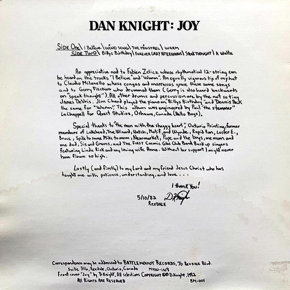 Канадец Dan Knight, несомненно, амбициозный автор песен, на своём единственном (но не классически), редком и ещё ни разу не переиздававшемся альбоме "Joy" (1982), энергично совмещает психоделический рок, нью-эйдж и современный фолк, чтобы донести своё послание до слушателя с пугающей интенсивностью. Его воздушный стиль гитарной реверберации, честно говоря, был бы уместен на каком-нибудь релизе в стиле дрим-поп, но он удачно сочетает его здесь с мечтательным бэк-вокалом и пугающе высоким качеством продакшена (особенно для записи, выпущенной частным образом на штучном лейбле "Battlemount Records").