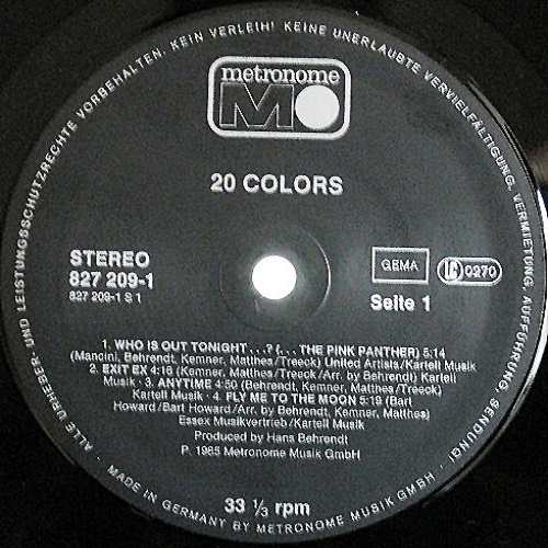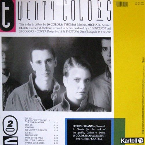 20 Colors (известные ещё как Twenty Colours) – это как немецкие Matt Bianco из Лондона, только без хитов. Звучание слишком явно заимствовано у британского аналога. Особенно синтетический клавишный бас. Песни цепляют, в них достаточно грува, они качают и свингуют. Так почему же среди них нет лидеров чартов? Это, очевидно, заслуга певицы Эллен Трик, чей голос совершенно невыразителен и бессилен. С ним она вряд ли продвинулась на DSDS, «Голосе Германии», Popstars и т.п. состязаниях.