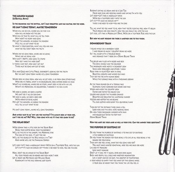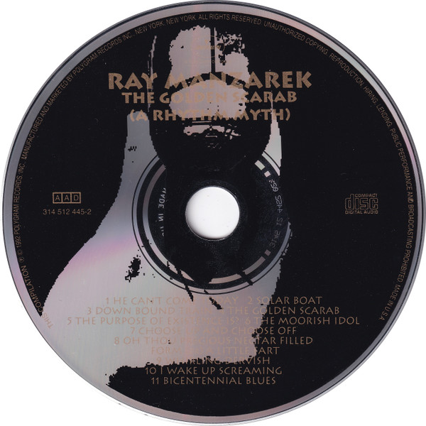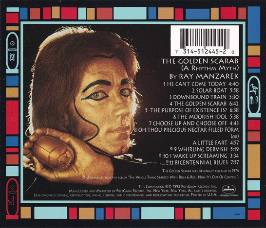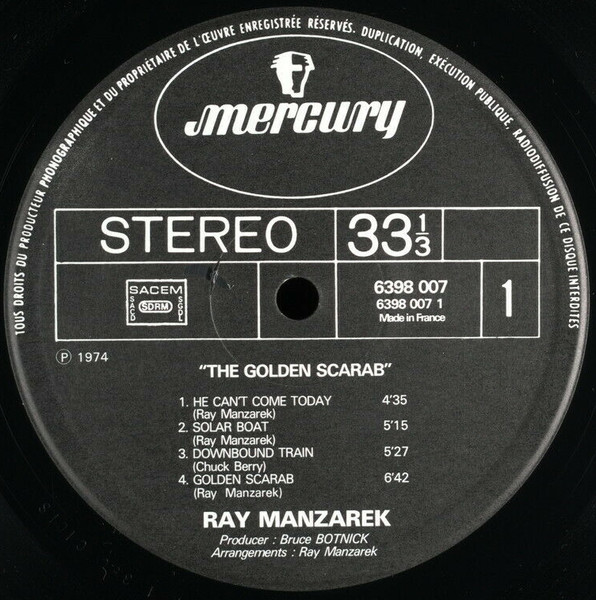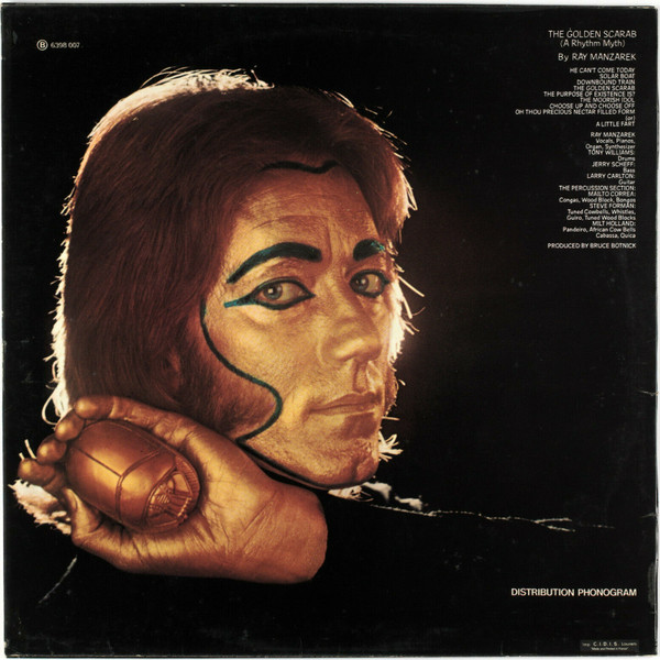 Новый альбом Рэя, получивший название The Golden Scarab (“Золотой скарабей”), был концептуальным альбомом в египетской тематике, который он описал как вдохновленный кислотой и семью годами существования a Door. “Золотой скарабей" рассказывает историю экстрасенсорного путешествия. Парень ждет Мессию; ждет кого-то, кто укажет ему путь. Но в конце концов он обнаруживает, что может сделать это только сам. Принимайте жизнь такой, какая она есть. Не судите ее. Наслаждайтесь ею. Это жизнь! В музыкальном плане он перекликается с первыми двумя альбомами The Doors. Это рок-н-ролл плюс. Плюс чикагский блюз, русская классика, африканские ритмы, бразильские ритмы и даже восточная музыка. Но с агрессивной основой в виде хард-рока». Некоторые из этих мелодий, написанных Манзареком, были отрепетированы с Робби и Джоном до того, как The Doors окончательно распались. Нажмите здесь, чтобы ознакомиться с треклистом и примечаниями.