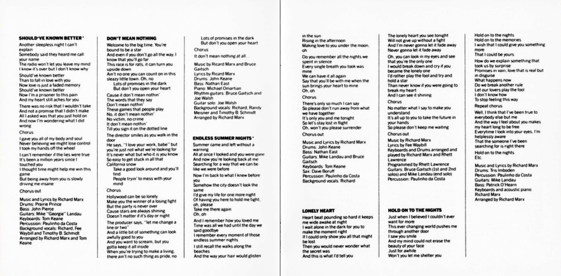 Ещё одним преимуществом Маркса стал состав музыкантов, игравших на альбоме. Менеджер Маркса убедил гитариста Eagles Джо Уолша сыграть в треке "Don't Mean Nothing". Два других участника Eagles, Рэнди Мейснер и Тимоти Б.Шмит, также исполнили бэк-вокал на этом треке. Впоследствии Маркс был номинирован на премию Грэмми в категории «Лучшее рок-вокальное исполнение - соло» за песню «Don’t Mean Nothing» в 1988 году.