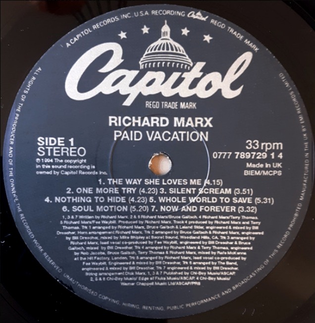 Very similar to Richard Marx - Paid Vacation but this version has an additional cat# on the disc face like Richard Marx - Paid Vacation has.
