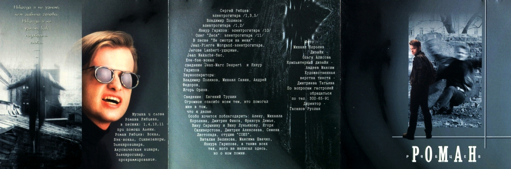 Новый альбом Ромы Рябцева – первая сольная работа бывшего композитора и участника супергруппы “Технология”. При том, что на пластинке четко сохранена традиционная рябцевская мелодика, целый ряд вещей являются абсолютно новаторскими для Романа, и сам он совершил очевидную эволюцию от “новой романтики” в сторону более жёсткой, живой, гитарной музыки. Хотя, по-моему, по-прежнему сильнее всего Рома в лирике и “медляках”.