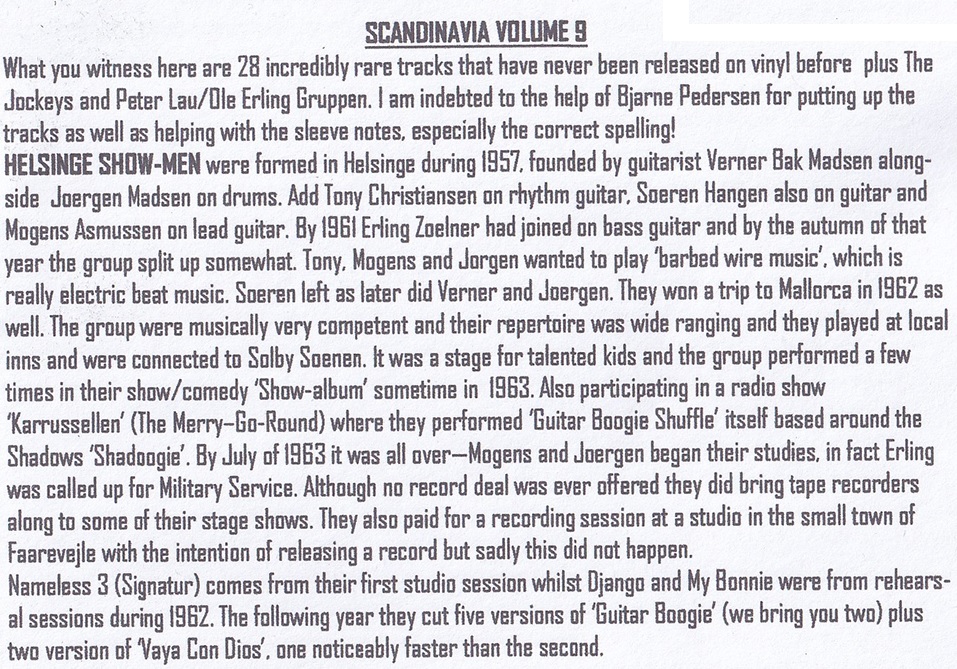 «Скандинавские инструментальные гитарные группы шестидесятых», V/A - Том 9, — это превосходный сборник, включающий в себя 30 известных международных хитов 1960-х годов, некоторые из которых были записаны на виниле, а другие никогда ранее не издавались. Некоторые треки считаются очень редкими.