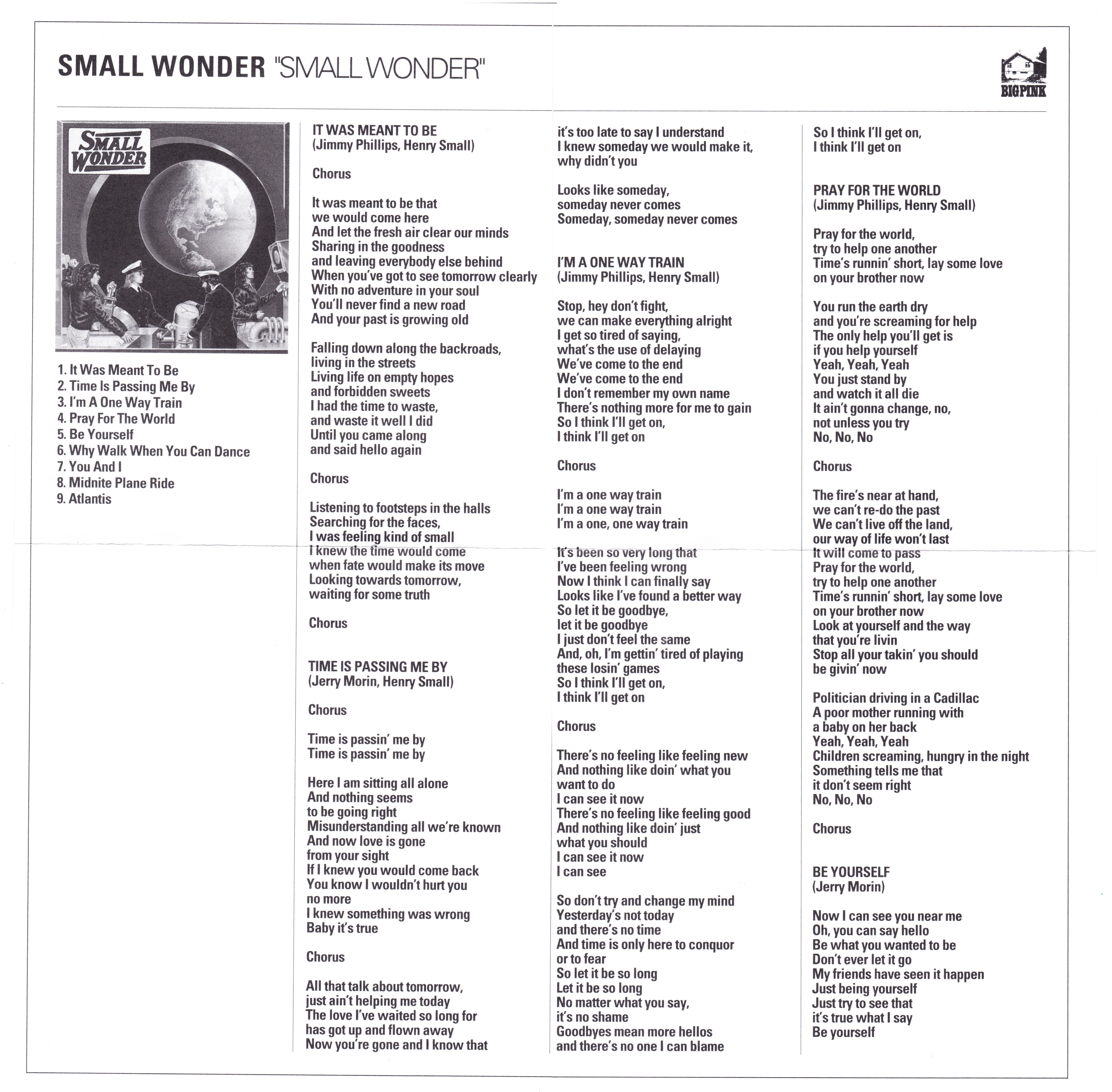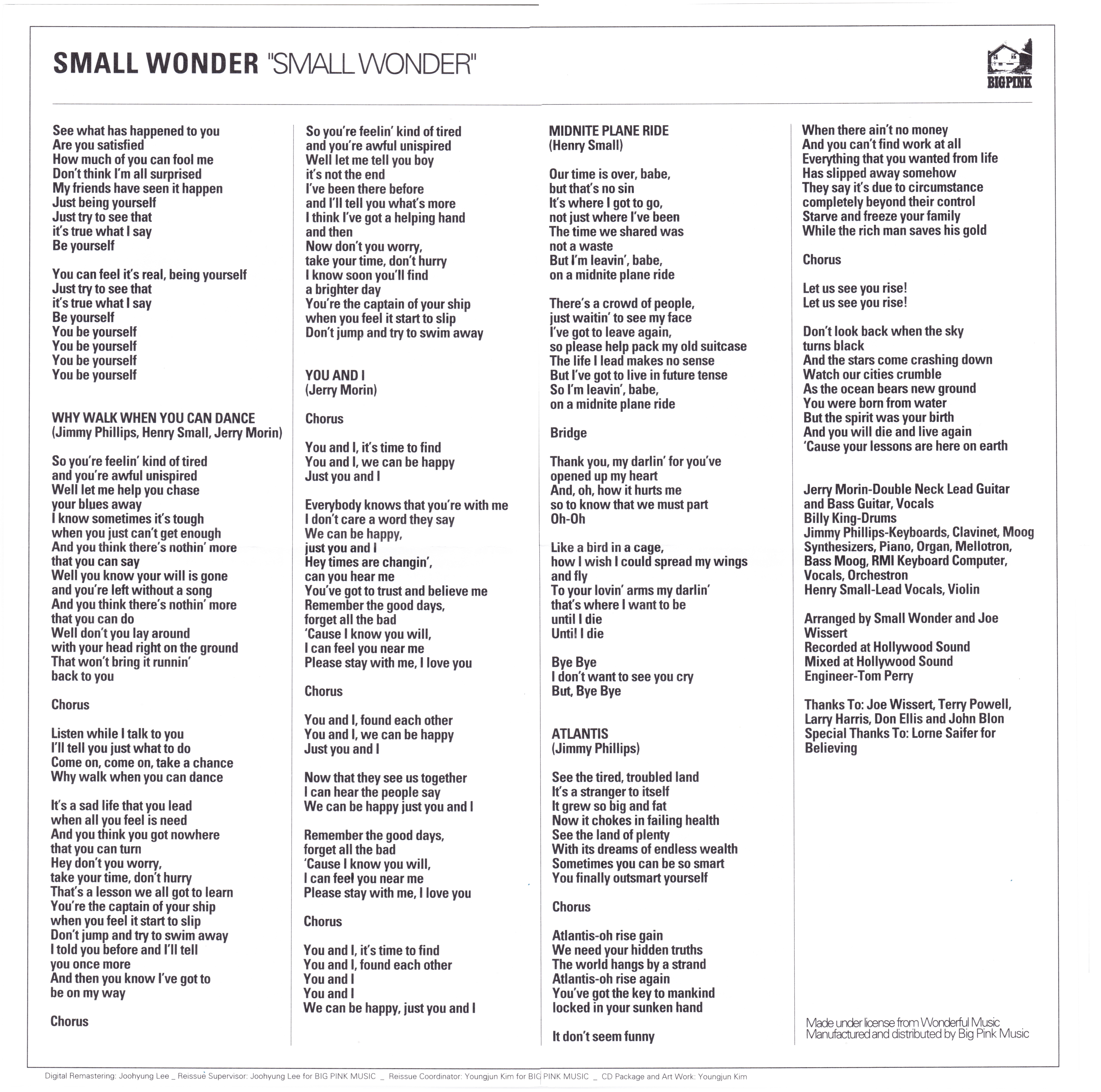 То, что Small Wonder не завоевали популярность, можно объяснить только самим фактом избытка похожих альбомов...Но звучит он, как прогрессивный альбом. Инструментарий включает в себя бас, скрипку и арсенал аналоговых клавишных, в первую очередь Mellotron (на каждом треке!), а также большое количество Moog. Очевидно, эти ребята были проггерами, которые опоздали на вечеринку и вместо этого попробовали себя в AOR. Мелодии хорошо написаны и в свое время они должны были оставить след.