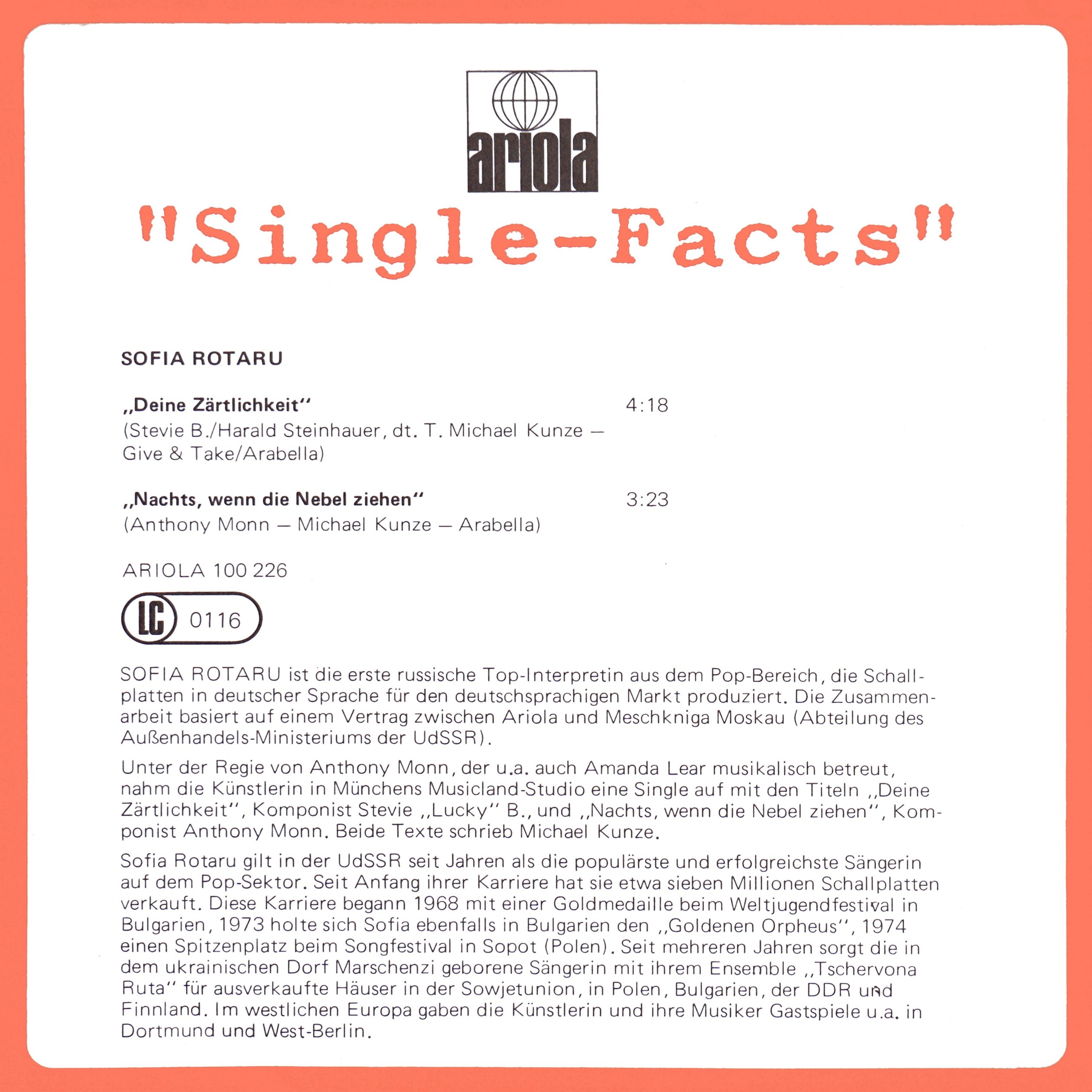► СОФИЯ РОТАРУ — первая ведущая российская поп-исполнительница, выпускающая пластинки на немецком языке для немецкоязычного рынка. Сотрудничество основано на договоре между «Ариолой» и «Мешконига Москва» (Отдел Министерства внешней торговли СССР).
