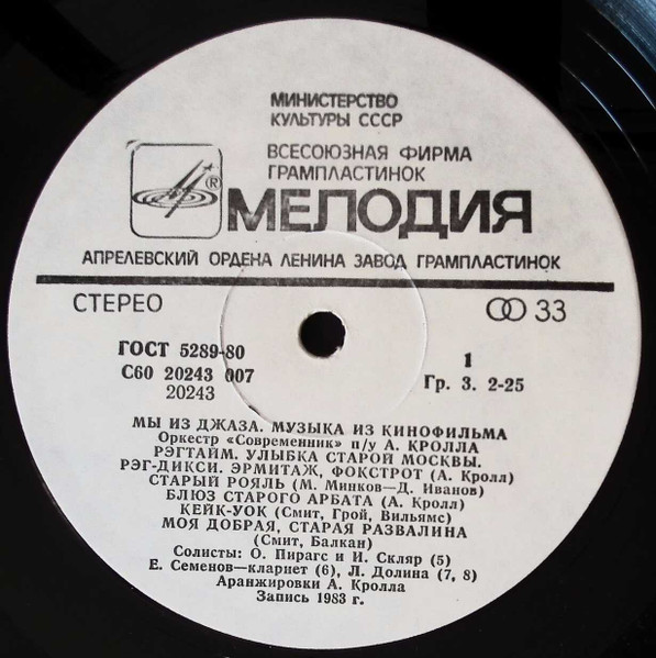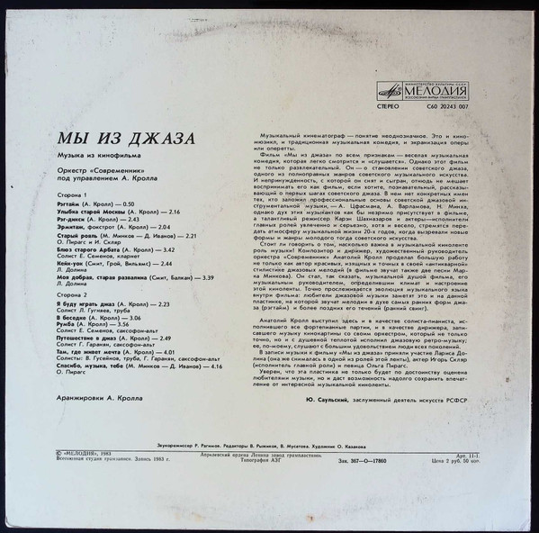 Альбом с музыкой из музыкальной комедии «Мы из джаза». Музыку написал композитор и дирижер Анатолий Кролл, также в альбоме есть две песни Марка Минкова. Инструментальные композиции исполняет оркестр «Современник» под руководством Кролла, а песни исполнили Лариса Долина, Игорь Скляр и Ольга Пирагс. Пластинку записали и выпустили в 1983 году, данное переиздание 2025 года