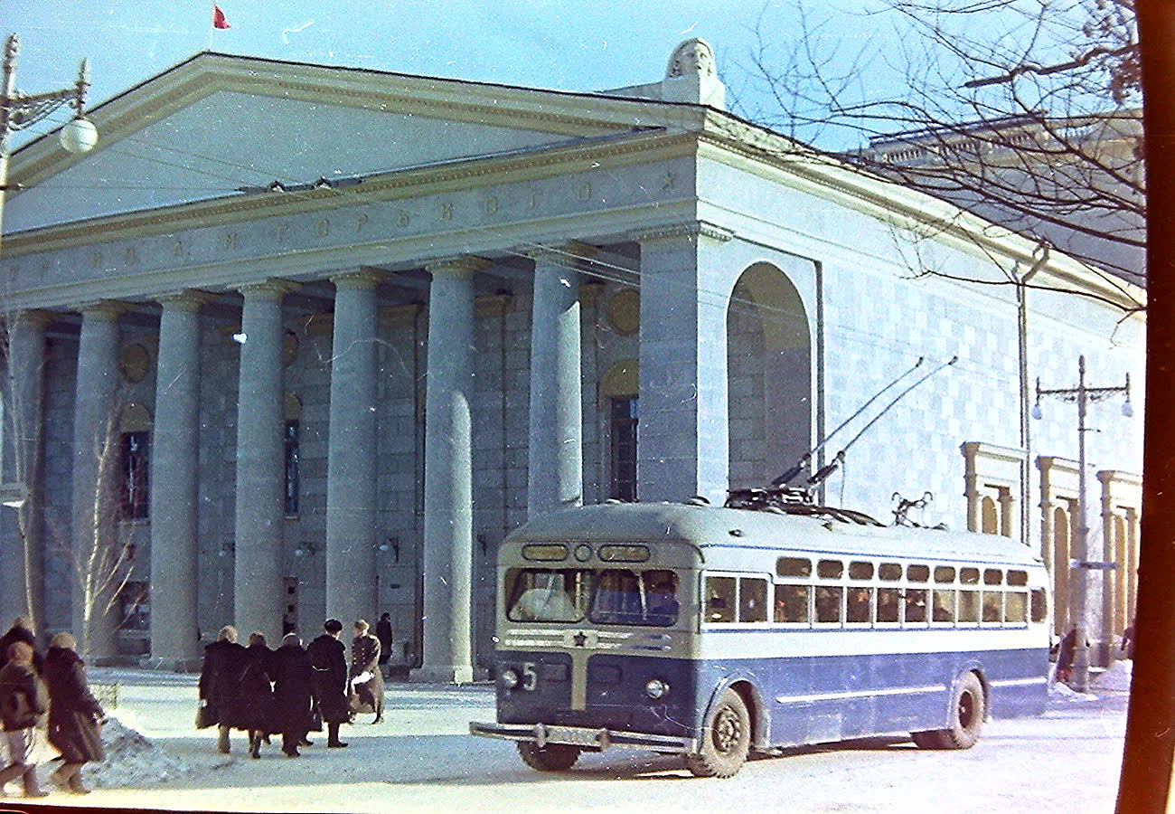 (7) МТБ 82Д, на ул.Советской. Маршрут № 1. Цветное фото конца 50х годов. Троллейбус выпуска 1953 года. Из первого прихода троллейбусов в Оренбург. Фото из открытых источников.