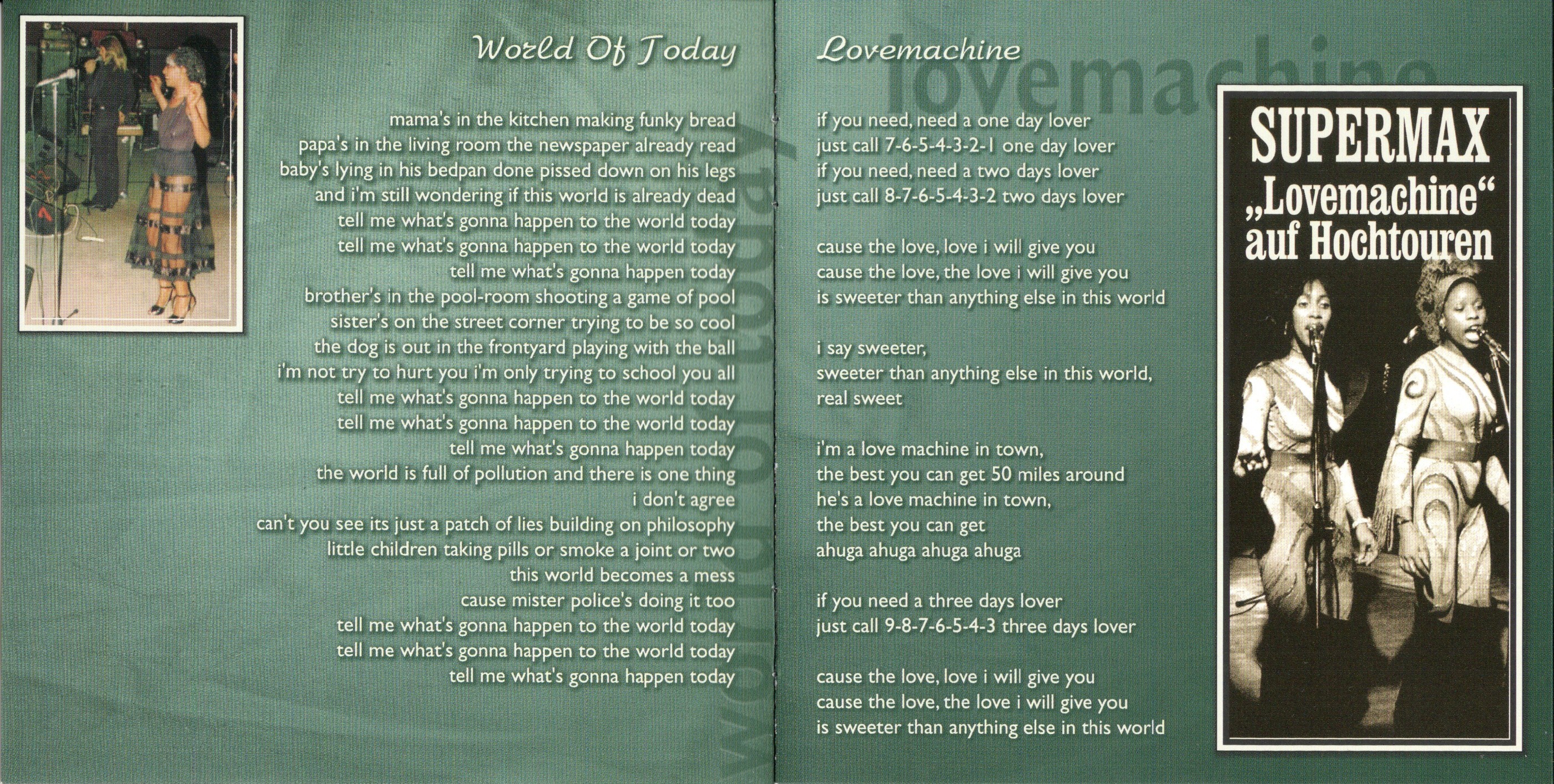 World of Today содержит одну из наиболее популярных композиций Supermax «Lovemachine», попавшую в чарты Германии (4 место), Швейцарии (6 место), Австрии (9 место) и США (96 место). Всё треки на этом альбоме записаны в таких жанрах, как спейс-диско и фанк-рок.