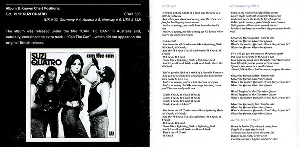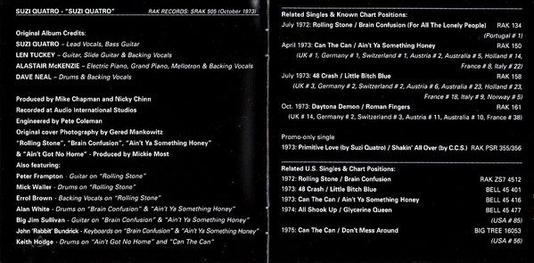 "Suzi Quatro" - расширенное ремастированное переиздание дебютного альбома Suzi Quatro (помимо оригинального альбома издание содержит бонусный диск с записью композиций с синглов, выпущенных в поддержку альбома), выпущенного в 1973 году фирмой RAK Records, в США - в 1974 году фирмой Bell Records, в Австралии выпускался под названием Can the Can. Есть и лимитированное издание в 1000 экземпляров на двойном розовом виниле.
