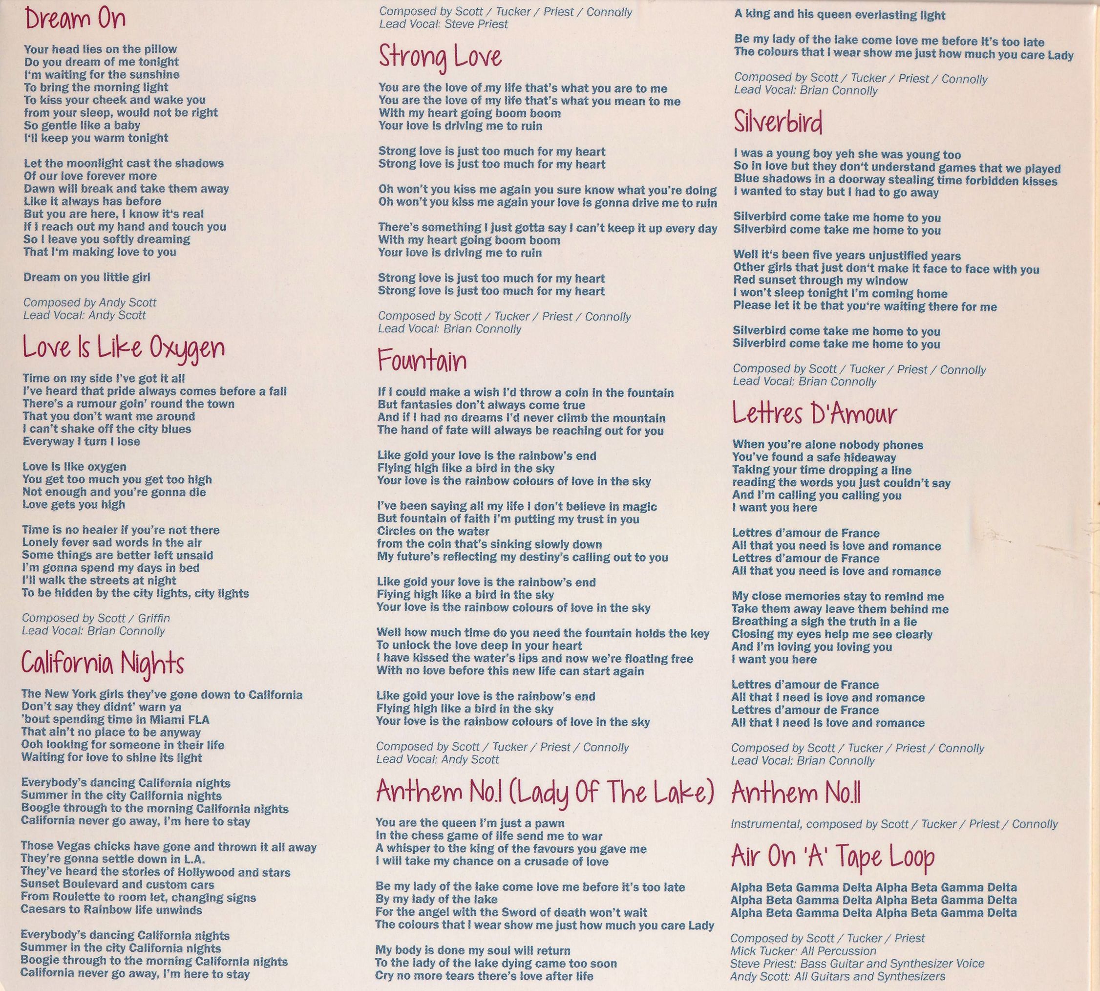 All tracks written by Andrew David Scott, Michael Thomas Tucker, Stephen Norman Priest, Brian Francis Connolly except 1, 15, 18 by Andrew David Scott, 2 & 11 by Andrew David Scott & Trevor Griffin, 10 by Andrew David Scott, Michael Thomas Tucker & Stephen Norman Priest. Published by Maxwood Music Ltd.