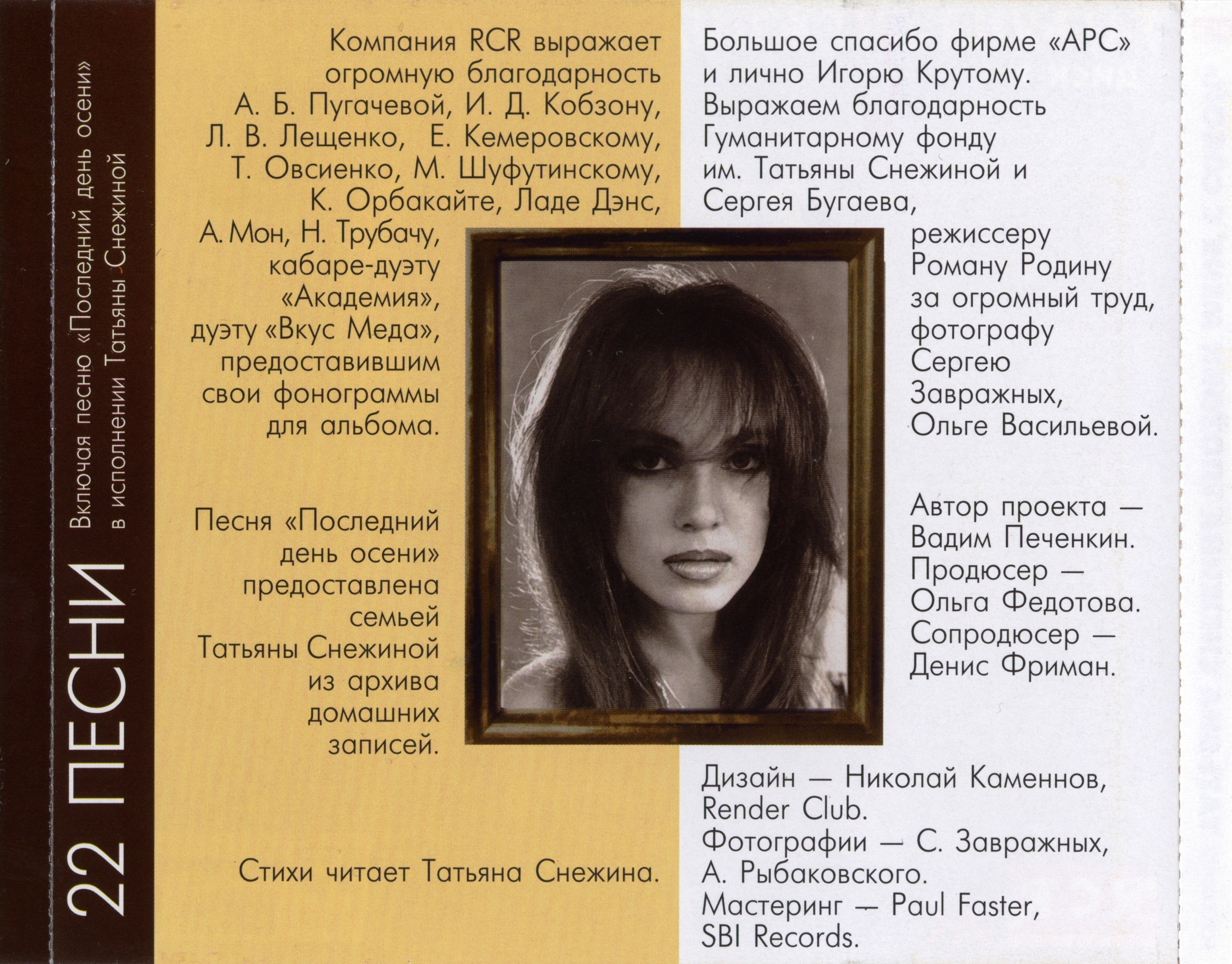 22 ПЕСНИ Включая песню «Последний день осени» в исполнении Татьяны Снежиной