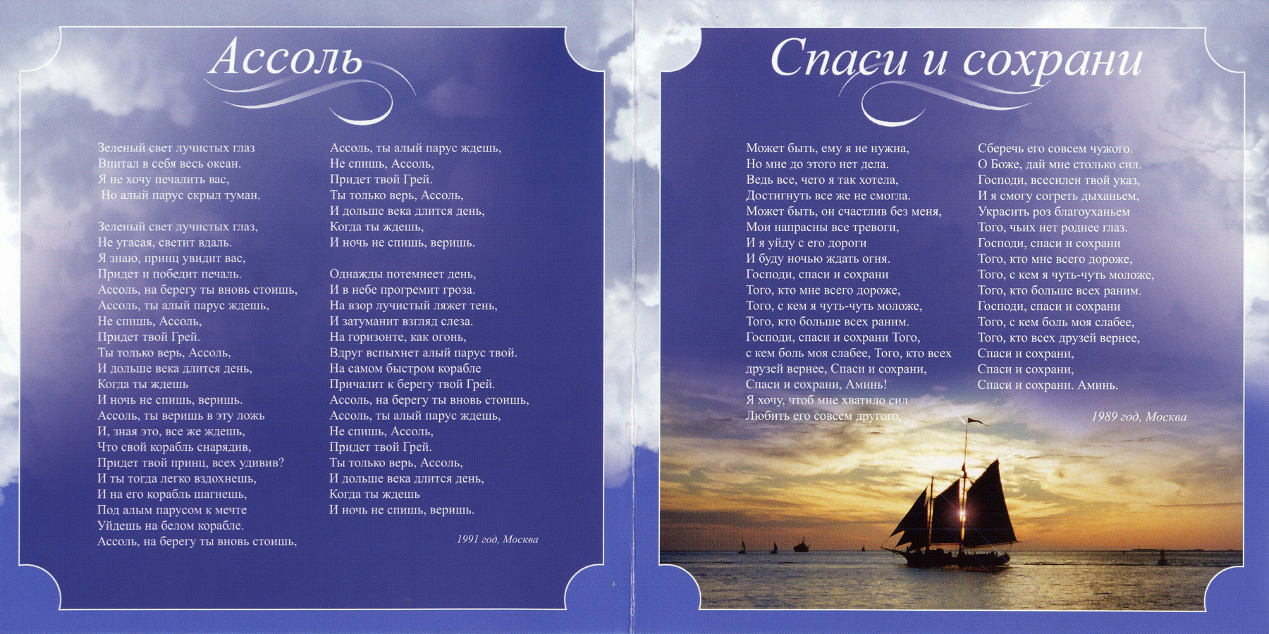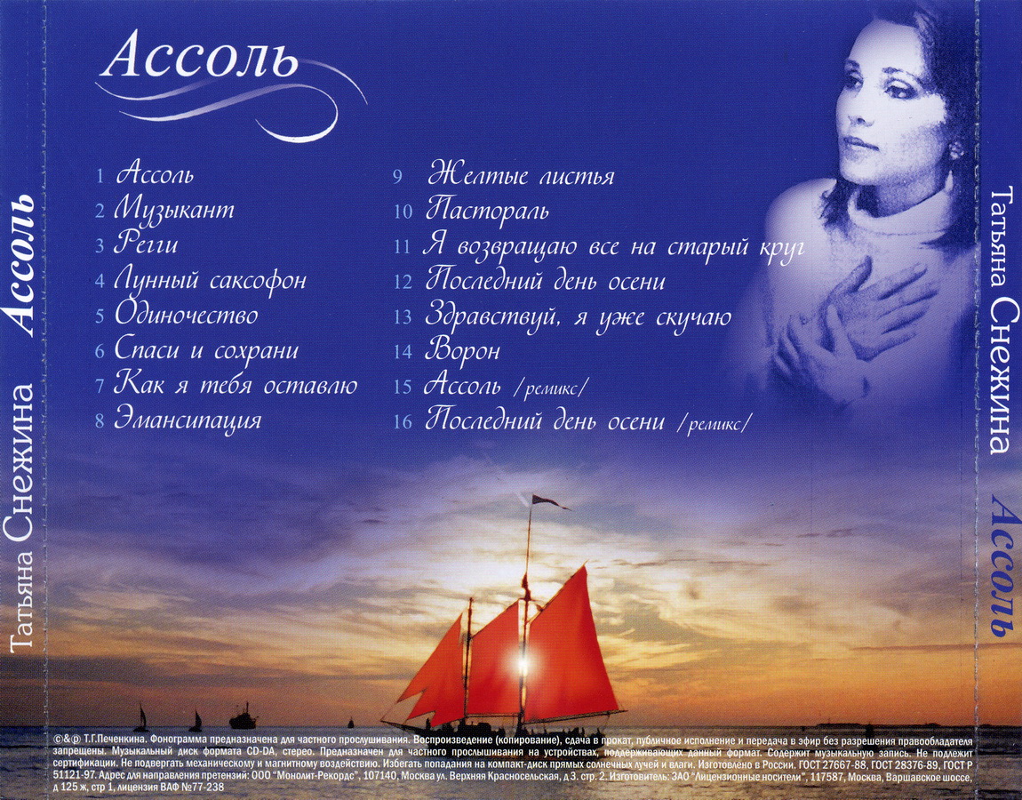 Диск выпущенный к сорокалетию со дня рождения Татьяны Снежиной третий диск - "Ассоль" продолжающий серию Уникального проекта "Все песни Татьяны Снежиной", включающий в себя записи из её семейного архива.