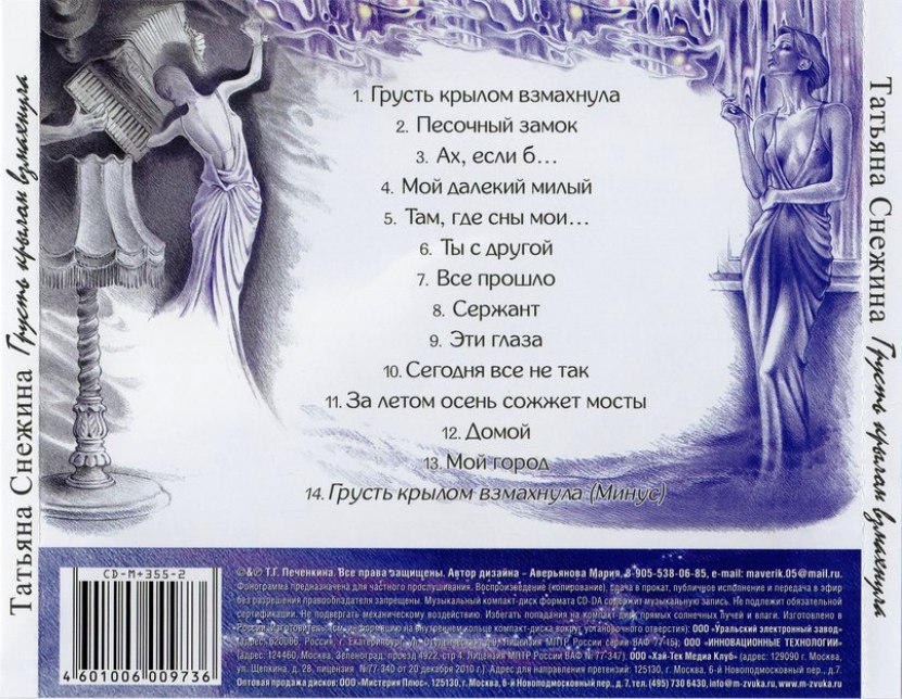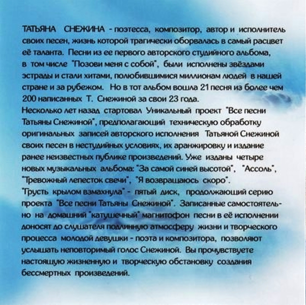 "Грусть крылом взмахнула" - пятый диск, продолжающий серию проекта "Все песни Татьяны Снежиной". Записанные самостоятельно на домашний "катушечный" магнитофон песни в её исполнении доносят до слушателя подлинную атмосферу жизни и творческого процесса молодой девушки - поэта и композитора, позволяют услышать неповторимый голос Снежиной. Вы прочувствуете настоящую жизненную и творческую обстановку создания бессмертных произведений.
