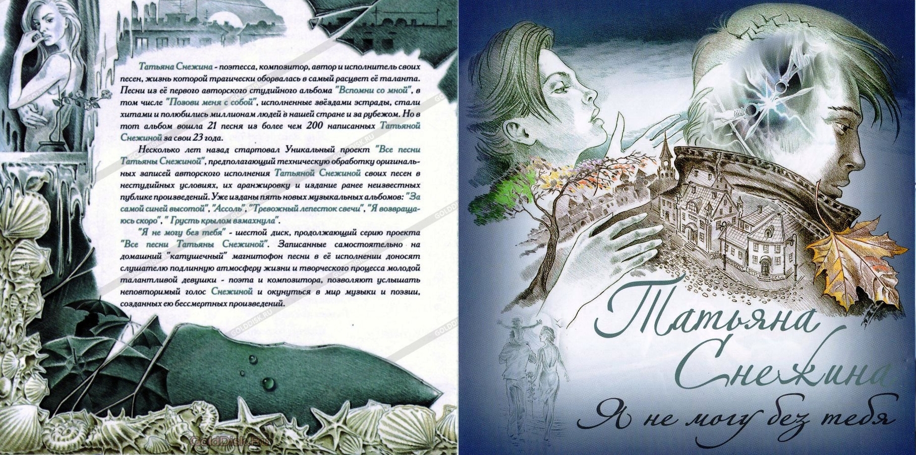 "Я не могу без тебя" - шестой диск, продолжающий серию проекта "Все песни Татьяны Снежиной". Записанные самостоятельно домашний "катушечный" магнитофон песни в её исполнении доносят слушателю подлинную атмосферу жизни и творческого процесса молодой талантливой девушки - поэта и композитора, позволяют услышать неповторимый голос Снежиной и окунуться в мир музыки и поэзии, созданных ею бессмертных произведений.