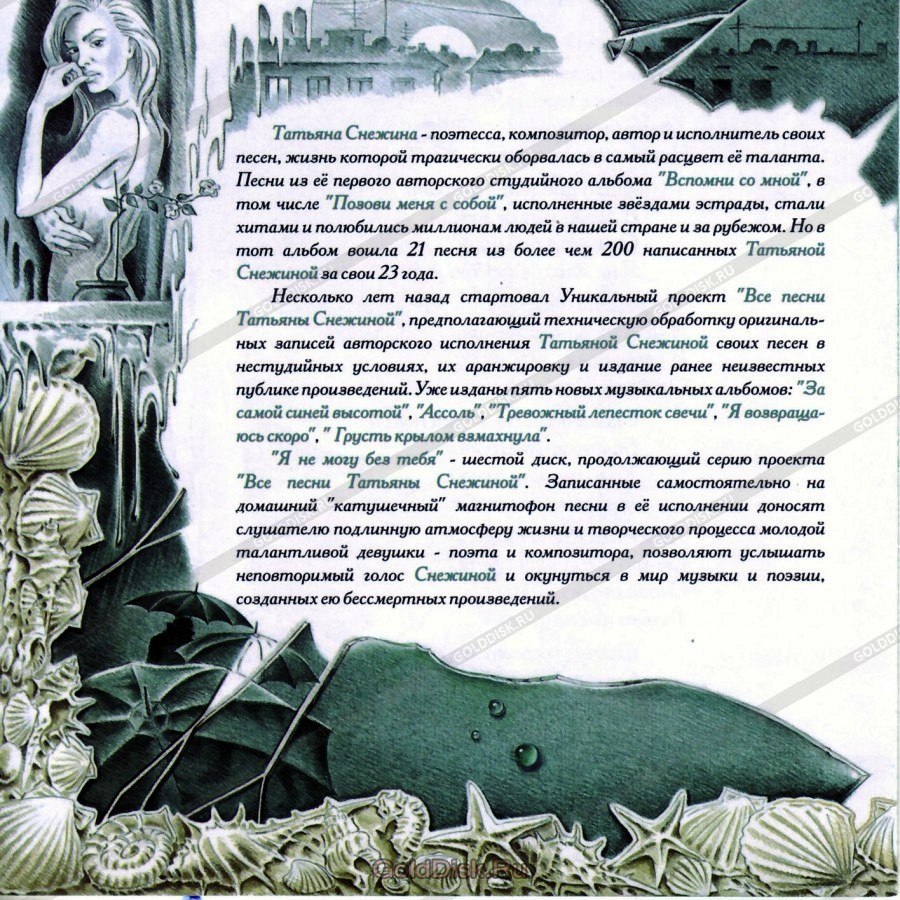 Татьяна Снежина - поэтесса, композитор, автор и исполнитель своих песен, жизнь которой трагически оборвалась в самый расцвет её таланта. Песни из её первого авторского студийного альбома "Вспомни со мной", в том числе "Позови меня с собой", исполненные звёздами эстрады, стали хитами и полюбились миллионам людей в нашей стране и за рубежом. Но в тот альбом вошла 21 песня из более чем 200 написанных Татьяной Снежиной за свои 23 года.