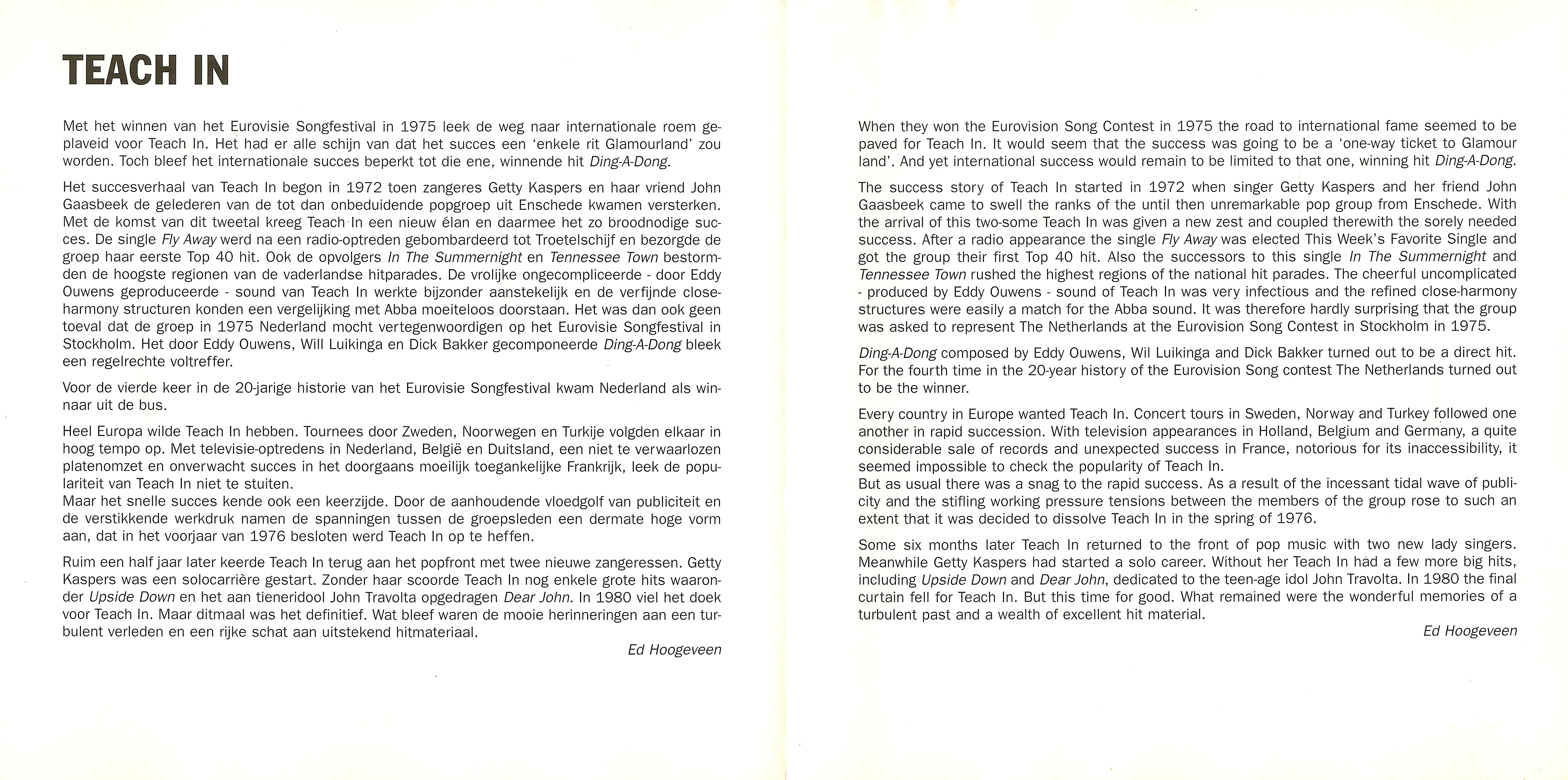 The success story of Teach In started in 1972 when singer Getty Kaspers and her friend John Gaasbeek came to swell the ranks of the until then unremarkable pop group from Enschede. With the arrival of this two-some Teach In was given a new zest and coupled therewith the sorely needed success. After a radio appearance the single Fly Away was elected This Week's Favorite Single and got the group their first Top 40 hit. Also the successors to this single In The Summernight and Tennessee Town rushed the highest regions of the national hit parades. The cheerful uncomplicated - produced by Eddy Ouwens - sound of Teach In was very infectious and the refined close-harmony structures were easily a match for the Abba sound. It was therefore hardly surprising that the group was asked to represent The Netherlands at the Eurovision Song Contest in Stockholm in 1975.