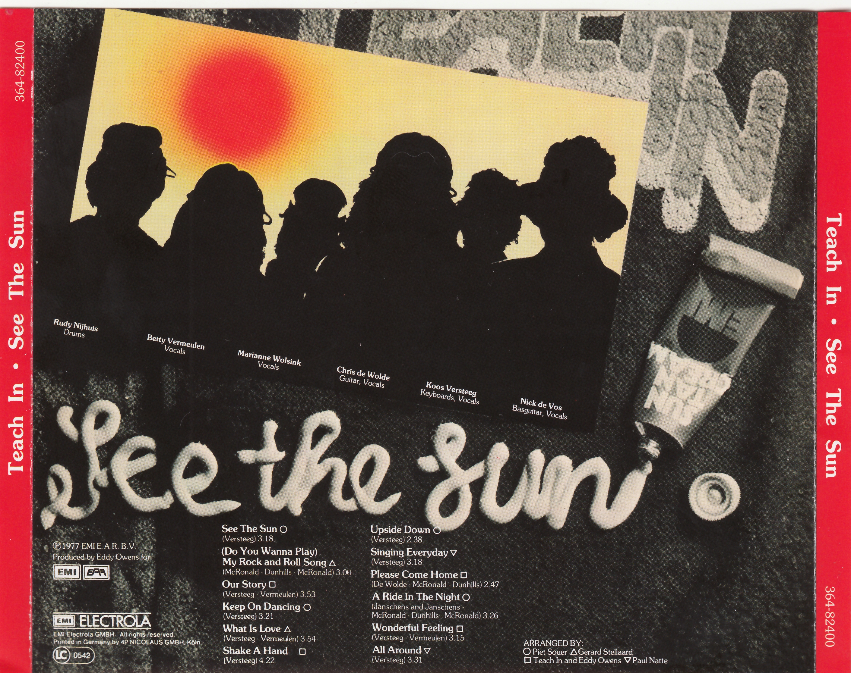 ► Напряжённая работа в студии в сочетании с бесконечными концертными турами оказалась для группы непосильной нагрузкой. В феврале 1976 г. после серии конфликтов Teach-In распались. К осени 1976 г. Кус и Руди во второй раз восстанавливают группу. Новые участники – басист Ханс Ниланд, певец и гитарист Геррит Трип и две вокалистки: темноволосая Бетти Вермёлен и белокурая Марианне Волсинк. В ноябре 1976 г. свет увидел первый плод творческих потуг нового коллектива – сингл «Upside Down». Песня была выдержана в тех же традициях, что и записи 1974-75 гг., и повторила успех «Ding-A-Dong», заняв третье место в голландском чарте. Вдохновленные успехом «Upside Down», Teach In записывают в течение 1977 г. новую пластинку «See The Sun». Хотя группа постаралась придерживаться курса, заданного в предыдущие три года, ее звучание изменилось: в песнях появилось больше элементов рока, вокал стал более резким, аранжировки упростились, а мелодии несколько утратили живость и яркость.