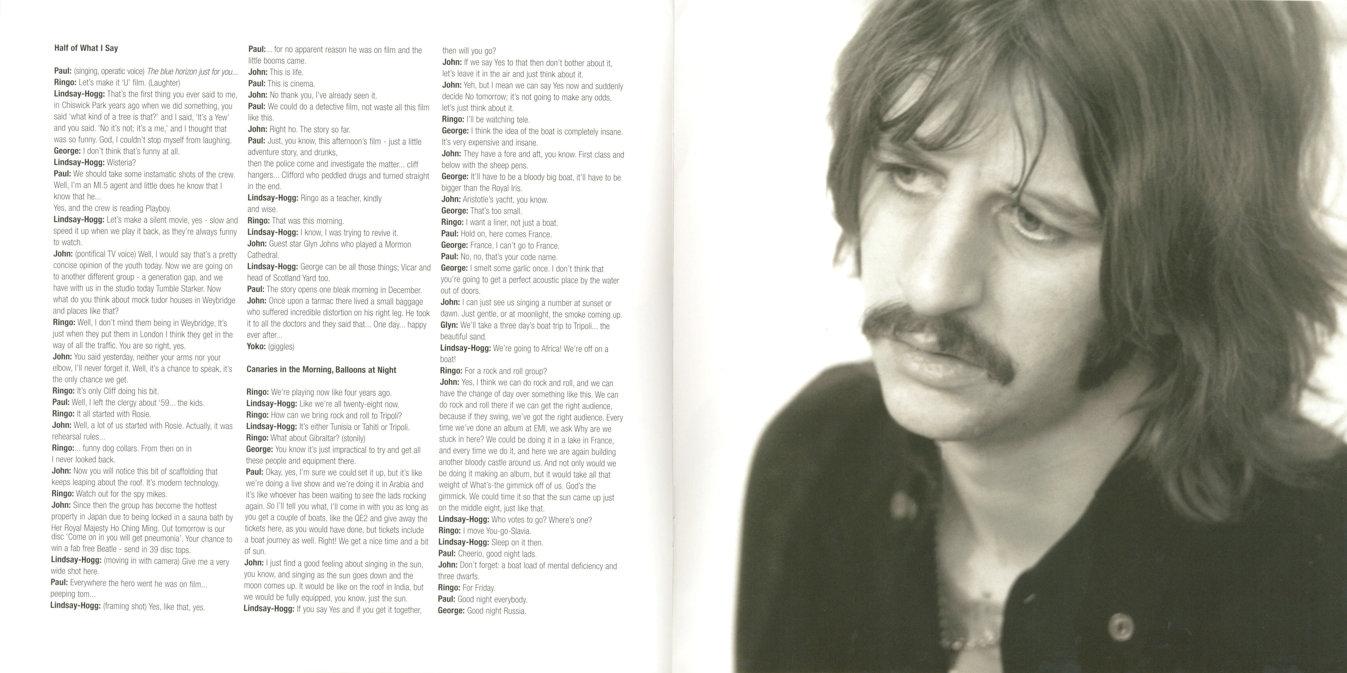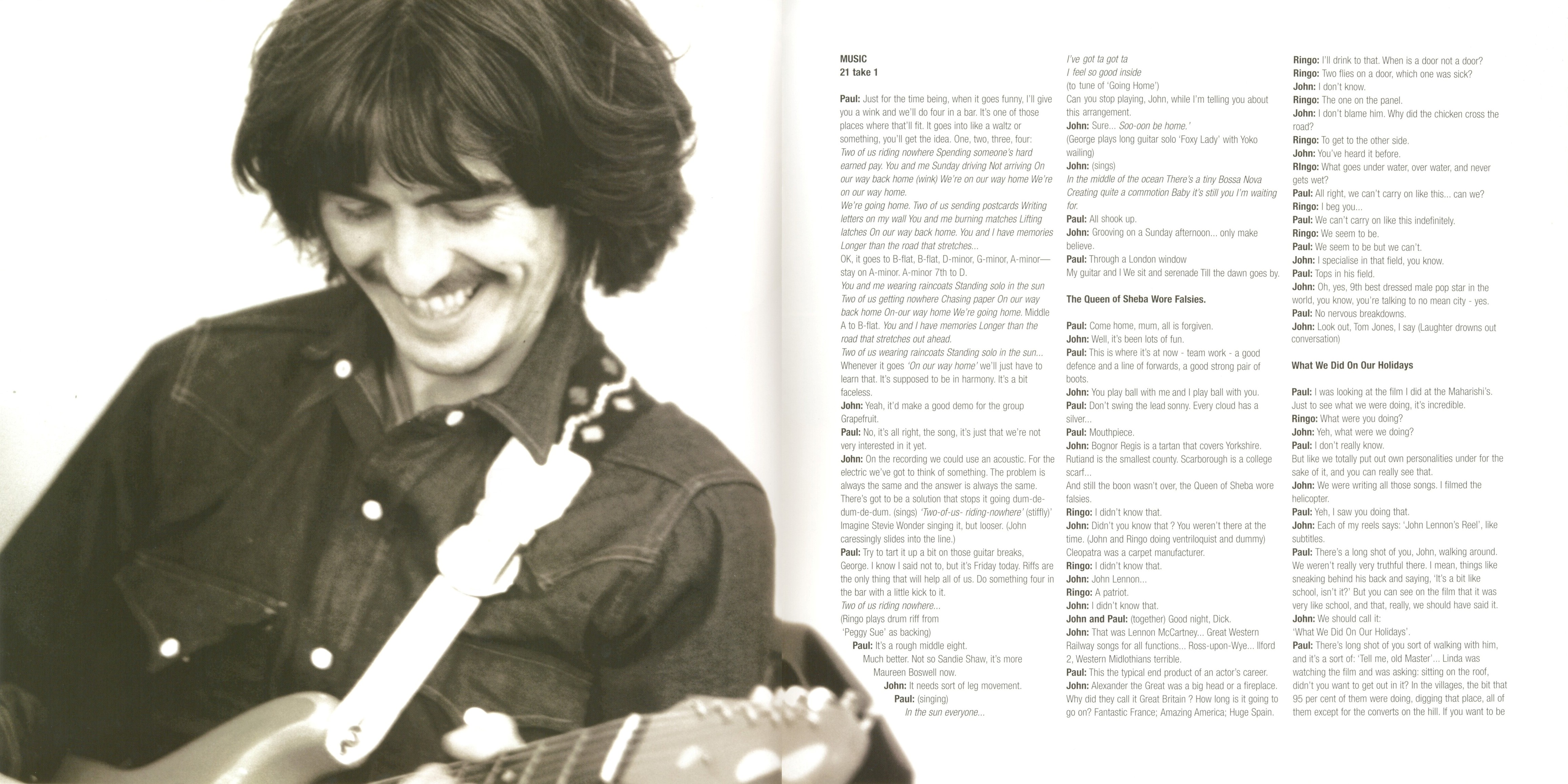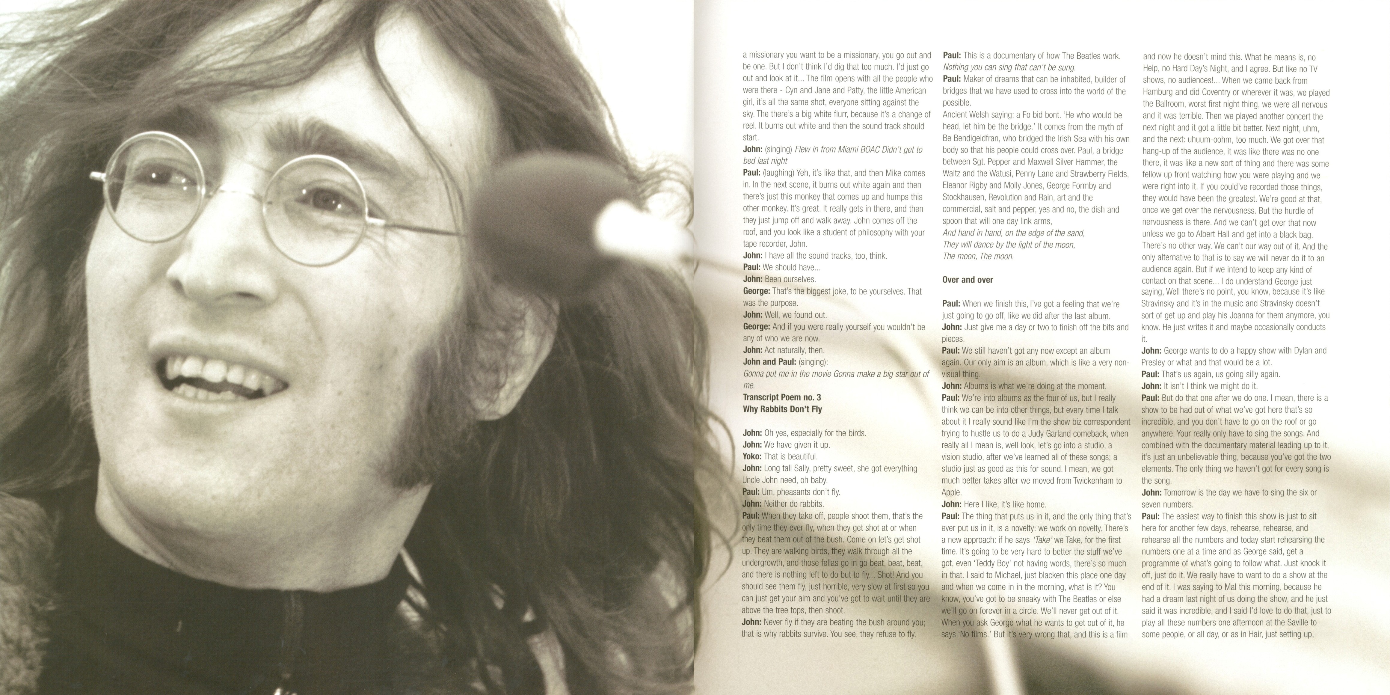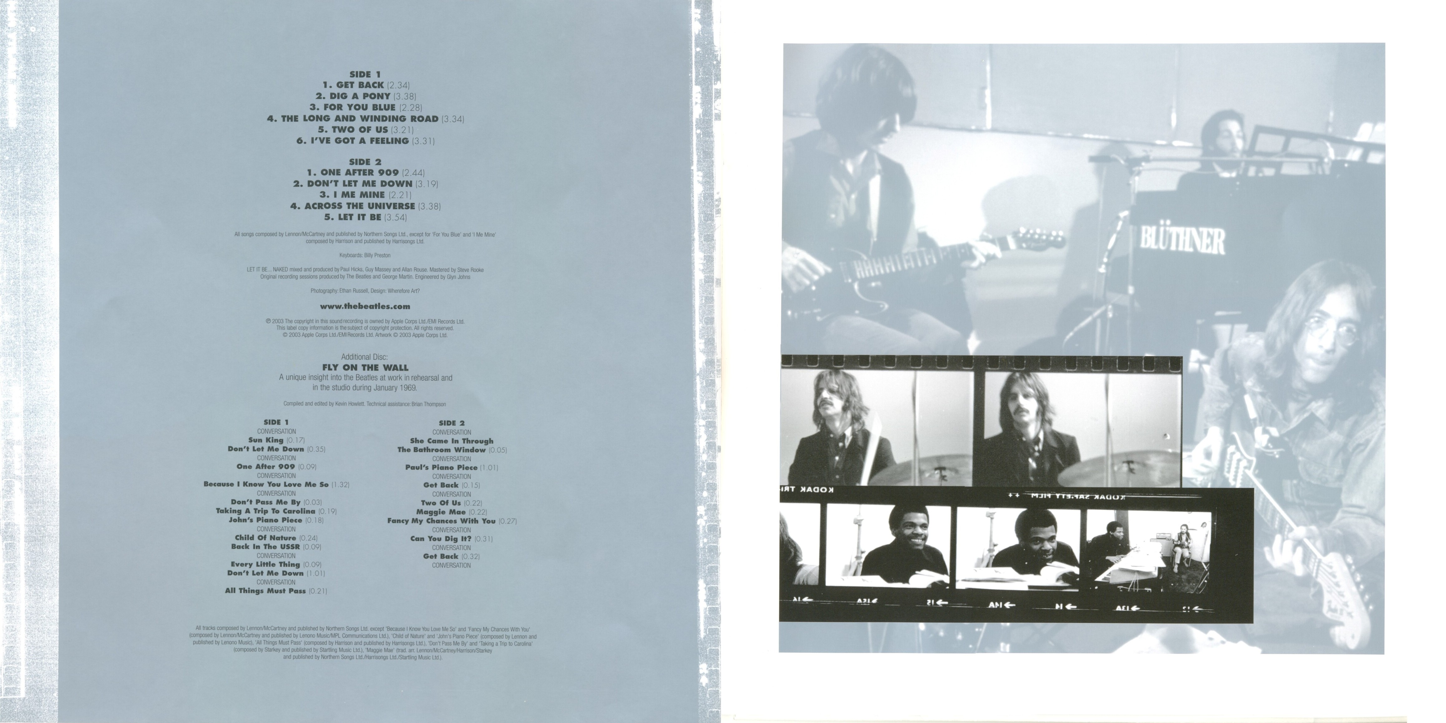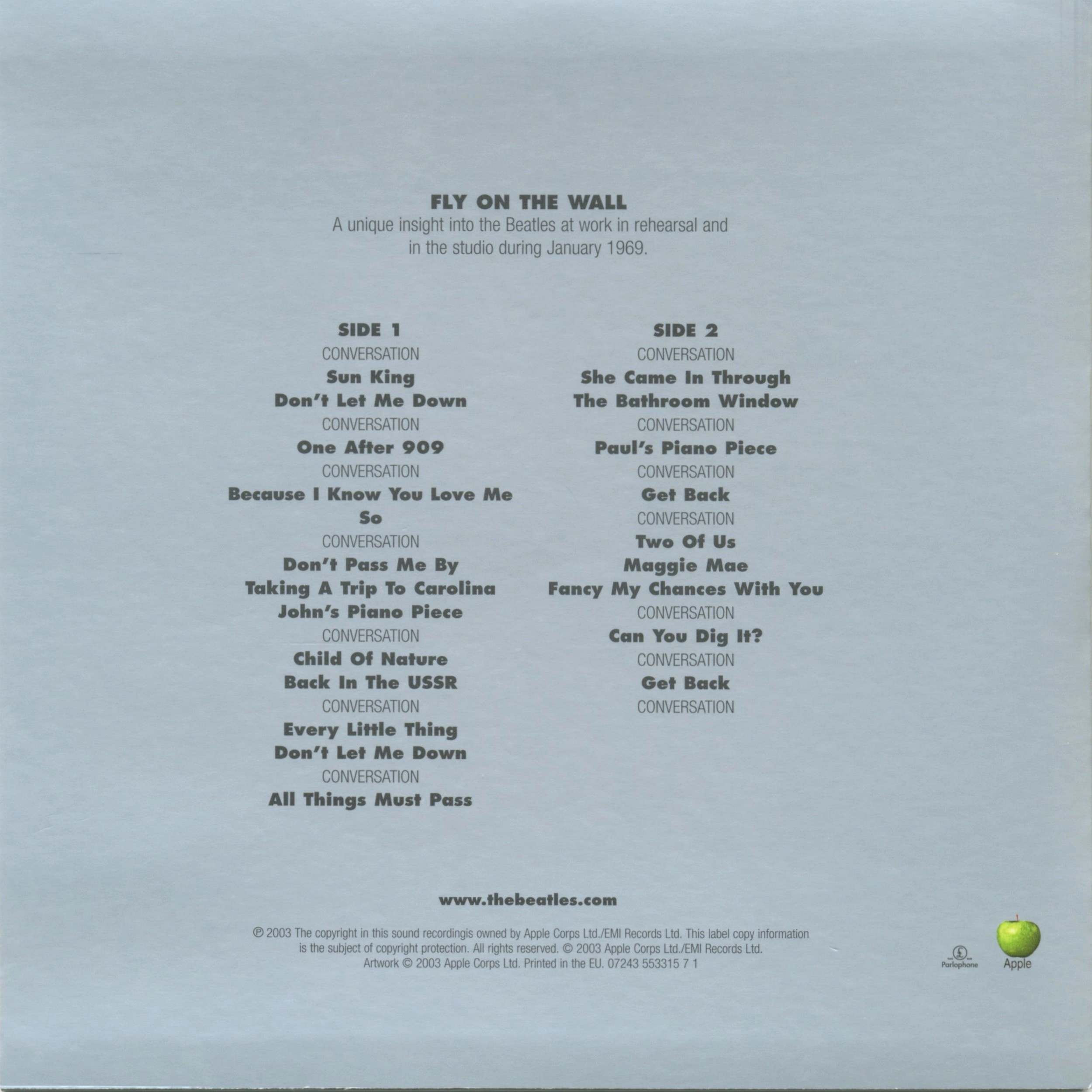 • Включает 20-страничный буклет размером 12 x 12 дюймов и дополнительный 7-дюймовый диск с 20 фрагментами песен: «Fly On The Wall»: «Уникальный взгляд на The Beatles на работе, на репетиции и в студии в январе 1969 года».