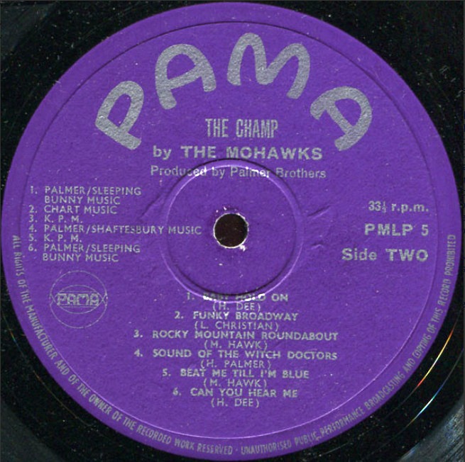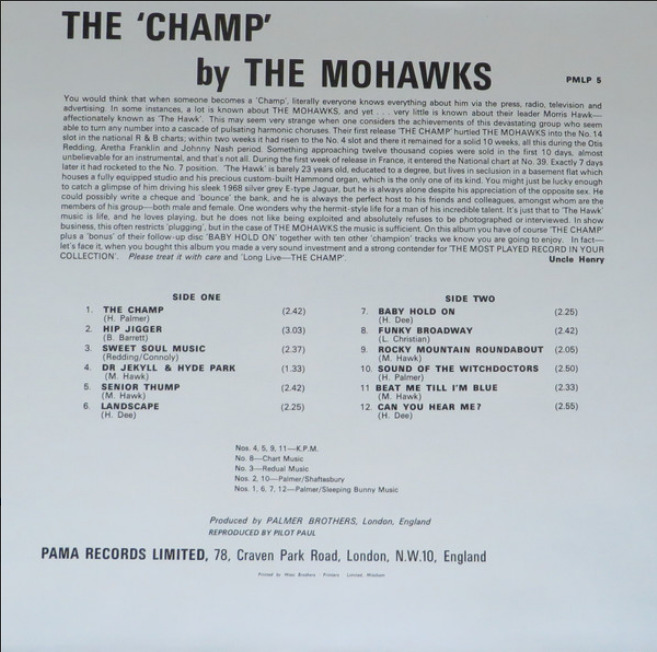 ► You would think that when someone becomes a 'Champ', literally everyone knows everything about him via the press, radio, television and advertising. In some instances, a lot is known about THE MOHAWKS, and yet... very little is known about their leader Morris Hawk- affectionately known as The Hawk. This may seem very strange when one considers the achievements of this devastating group who seem able to turn any number into a cascade of pulsating harmonic choruses. Their first release "THE CHAMP hurtled THE MOHAWKS into the No. 14 slot in the national R & B charts; within two weeks it had risen to the No. 4 slot and there it remained for a solid 10 weeks, all this during the Otis Redding. Aretha Franklin and Johnny Nash period. Something approaching twelve thousand copies were sold in the first 10 days, almost unbelievable for an instrumental, and that's not all. During the first week of release in France, it entered the National chart at No. 39. Exactly 7 days later it had rocketed to the No. 7 position. The Hawk' is barely 23 years old, educated to a degree, but lives in seclusion in a basement flat which houses a fully equipped studio and his precious custom-built Hammond organ, which is the only one of its kind. You might just be lucky enough to catch a glimpse of him driving his sleek 1968 silver grey E-type Jaguar, but he is always alone despite his appreciation of the opposite sex. He could possibly write a cheque and "bounce" the bank, and he is always the perfect host to his friends and colleagues, amongst whom are the members of his group-both male and female. One wonders why the hermit-style life for a man of his incredible talent. It's just that to The Hawk music is life, and he loves playing, but he does not like being exploited and absolutely refuses to be photographed or interviewed. In show business, this often restricts 'plugging", but in the case of THE MOHAWKS the music is sufficient. On this album you have of course THE CHAMP plus a 'bonus' of their follow-up disc 'BABY HOLD ON' together with ten other 'champion' tracks we know you are going to enjoy. In fact let's face it, when you bought this album you made a very sound investment and a strong contender for THE MOST PLAYED RECORD IN YOUR COLLECTION. Please treat it with care and 'Long Live-THE CHAMP'.
