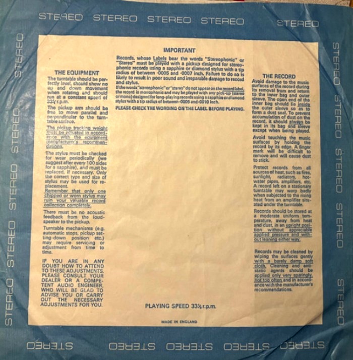 Back cover shows the ''indicator hole'' to let the inner sleeve peep through: blue=stereo, red =mono.