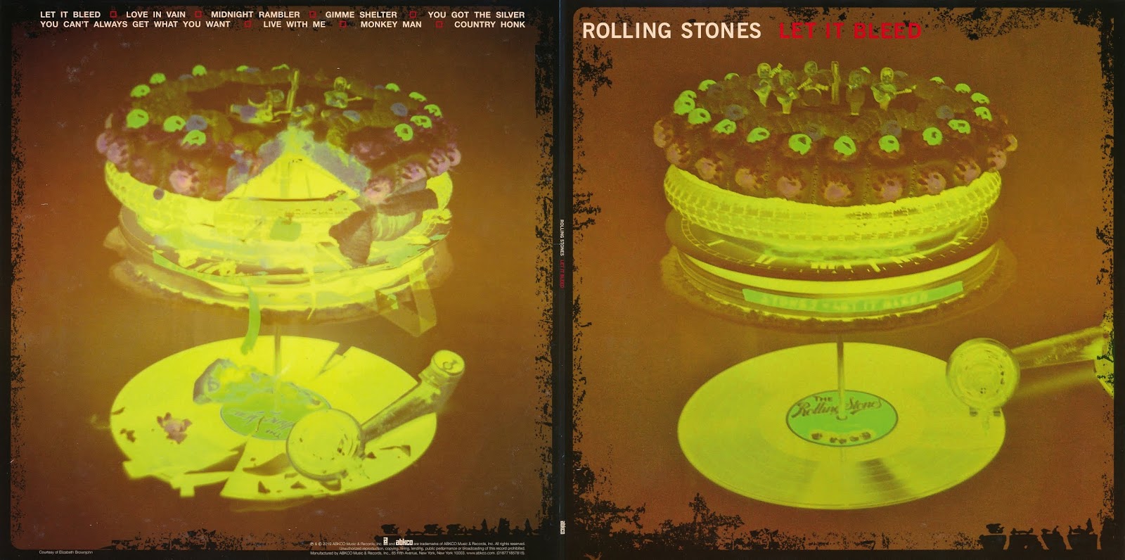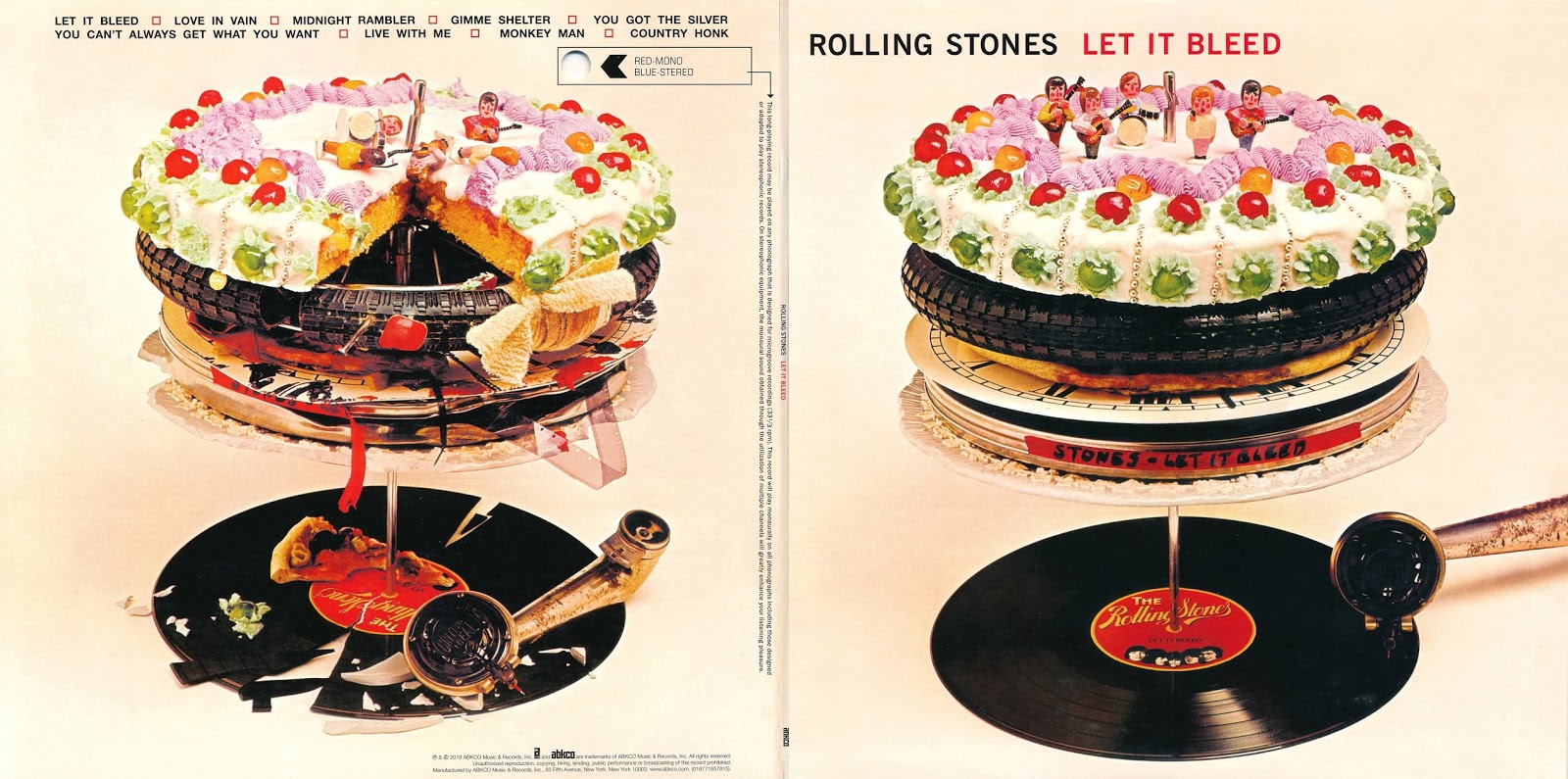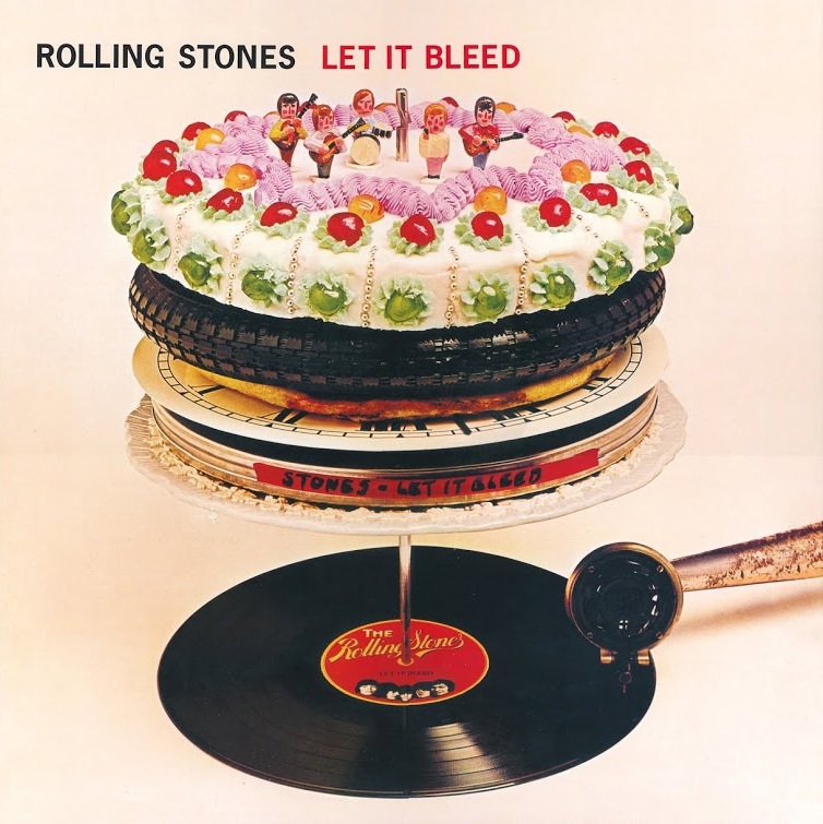 На обложке изображена сюрреалистическая скульптура, состоящая из пластинки Rolling Stones - Let It Bleed, которую проигрывает старинный патефонный звукосниматель. На шпинделе винил-чейнджера укреплено блюдо, на котором в несколько слоев лежат: бабина с плёнкой, подписанная Stones - Let It Bleed, часовой циферблат, пицца, велосипедная шина и торт с изысканной начинкой посреди которой стоят фигурки музыкантов рок-группы. Торт приготовила девушка по имени Делия Смит, которая позже стала известной в Англии писательницей книг по приготовлению пищи и популярной телеведущей кухонной телепередачи. На обратной стороне та же скульптура в разрушенном состоянии.