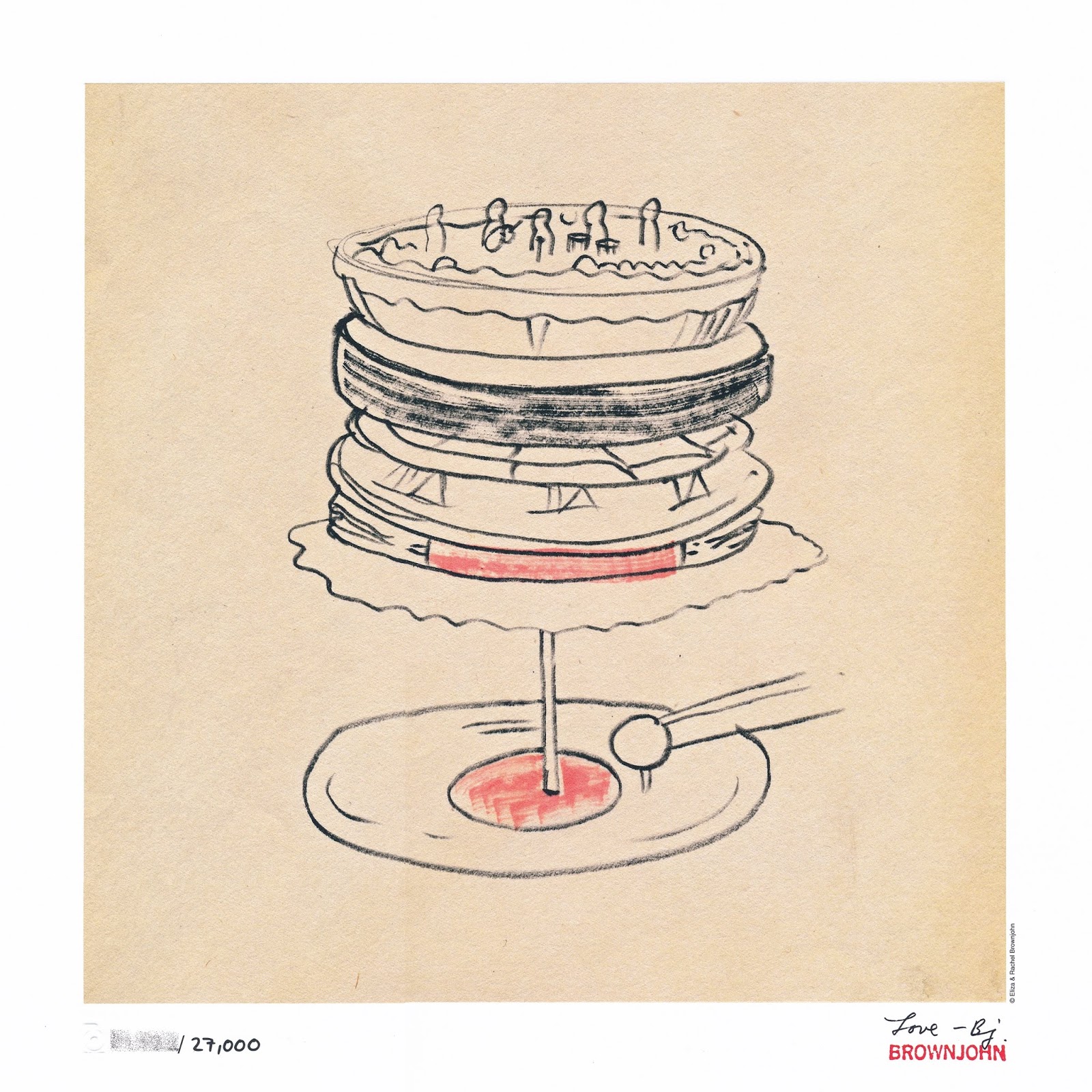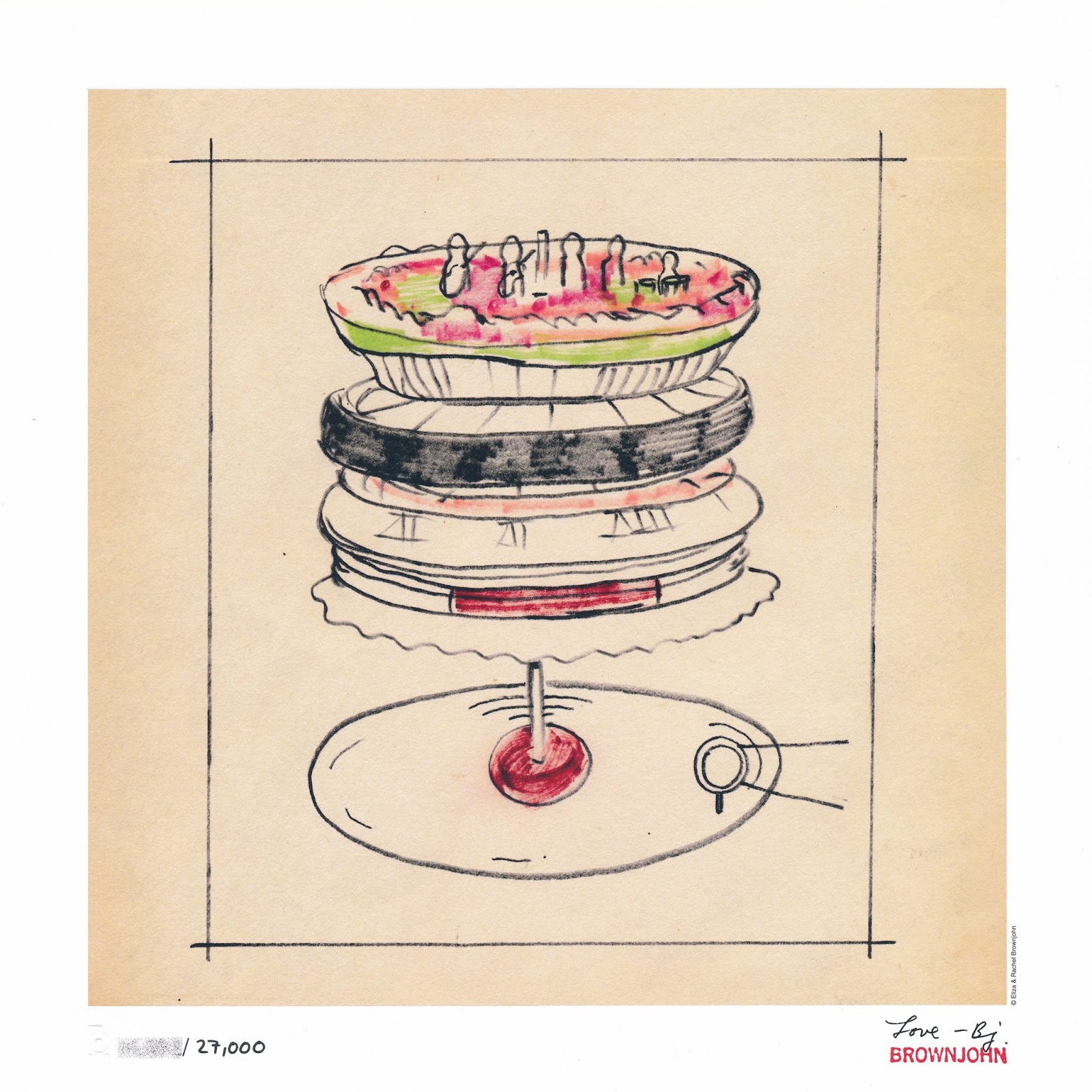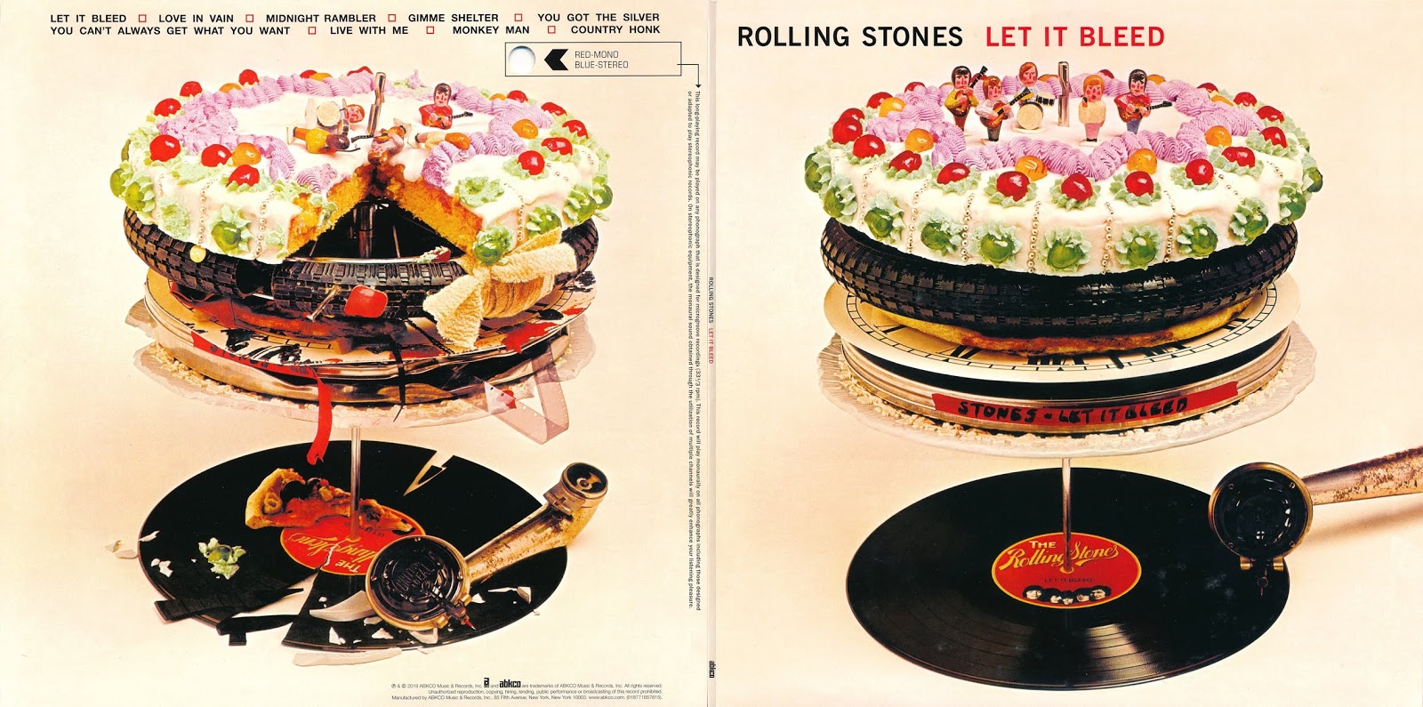 На обложке изображена сюрреалистическая скульптура, состоящая из пластинки Rolling Stones - Let It Bleed, которую проигрывает старинный патефонный звукосниматель. На шпинделе винил-чейнджера укреплено блюдо, на котором в несколько слоев лежат: бабина с плёнкой, подписанная Stones - Let It Bleed, часовой циферблат, пицца, велосипедная шина и торт с изысканной начинкой посреди которой стоят фигурки музыкантов рок-группы. Торт приготовила девушка по имени Делия Смит, которая позже стала известной в Англии писательницей книг по приготовлению пищи и популярной телеведущей кухонной телепередачи. На обратной стороне та же скульптура в разрушенном состоянии.