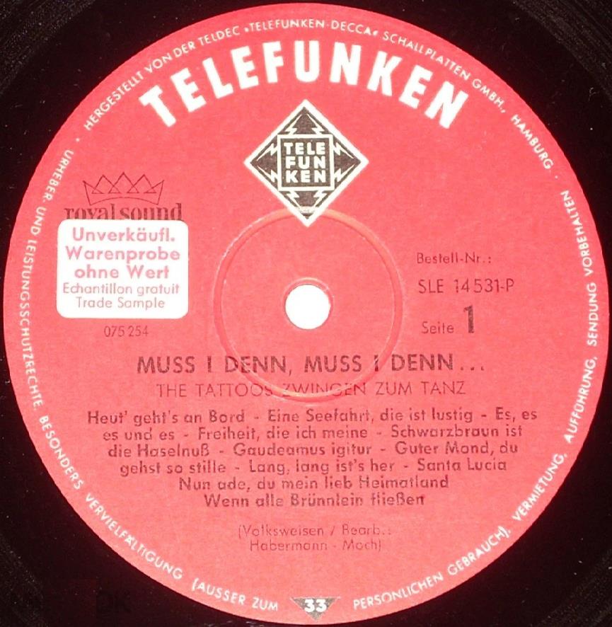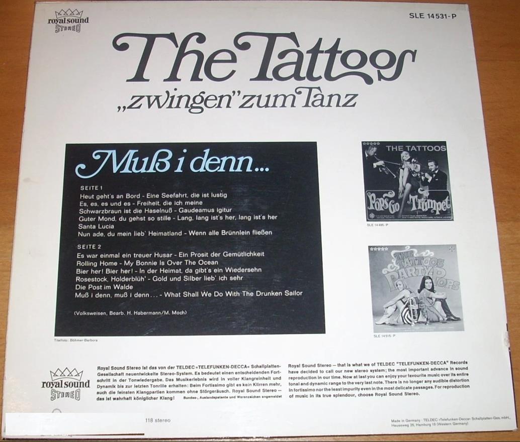 1967: Pops go Trumpet (SLE 14485-P) 1968: Party Pops (SLE 14515-P) 1968: The Tattoos zwingen zum Tanz: Muss i denn, muss i denn…(SLE 14531-P) 1968: Latin Pops (SLE 14551-P) 1968: Tattoos a Gogo (SLE 14564-P) 1971: Hot Trumpets (SLE 14588-P) 1971: Tattoos Aktuell (SLE 14634-P) 1972: The Original Tattoos (BASF 2021143-6) (Trumpets for Two) 1972: Swingin' with the Million Sellers (Ace Of Clubs — SCL 2-3001, Telefunken — TS.31531/2) 1973: Hawaiian trumpets (BASF 2021625-2) 1974: Reise In Den Süden (Hammonia Records — ST-HH-3002) 1978: Trompeten festival (released in 2008)