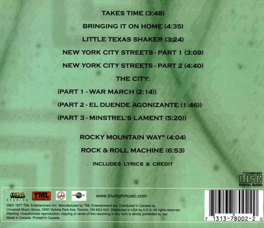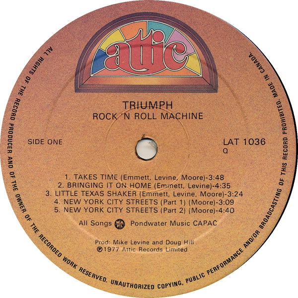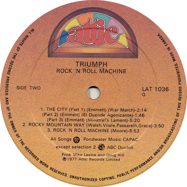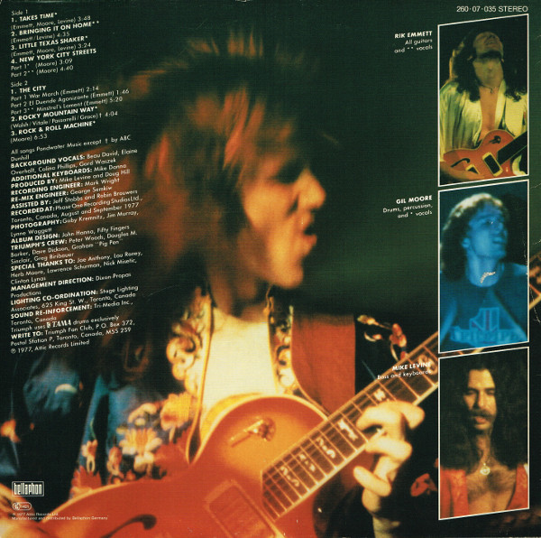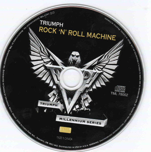Triumph - канадское пауэр-трио в составе Рика Эмметта (вокал, гитара), Гила Мура (ударные) и Майкла Левайна (бас-гитара, клавишные) и их второй альбом Rock'N'Roll Machine, который сначала был выпущен только в Канаде, но из-за растущей популярности набрал популярность во всем мире (международный контракт на запись альбома с RCA, а вскоре после этого с MCA Records). К сожалению, альбом был выпущен с одной обложкой и трек-листом для канадского релиза и с другой для мирового рынка, причем даже несколько треков имели совершенно разные названия. Очевидно, что с годами это привело к нелепой путанице, поскольку в одной версии даже было сведено несколько треков как с дебютного, так и с этого альбома. К счастью, эта маркетинговая оплошность была исправлена, когда на новых альбомах, прошедших ремастеринг, наконец-то появилась оригинальная обложка с изображением профиля группы в космической сфере, а не слащавая неоновая подсветка гитары и блестки под логотипом группы.