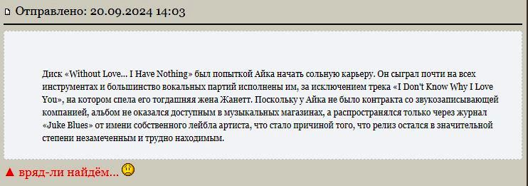 Найти альбом Ike Turner – Without Love... I Have Nothing (1996) на просторах инета не смог! Помогите найти этот альбом, пожалуйста!