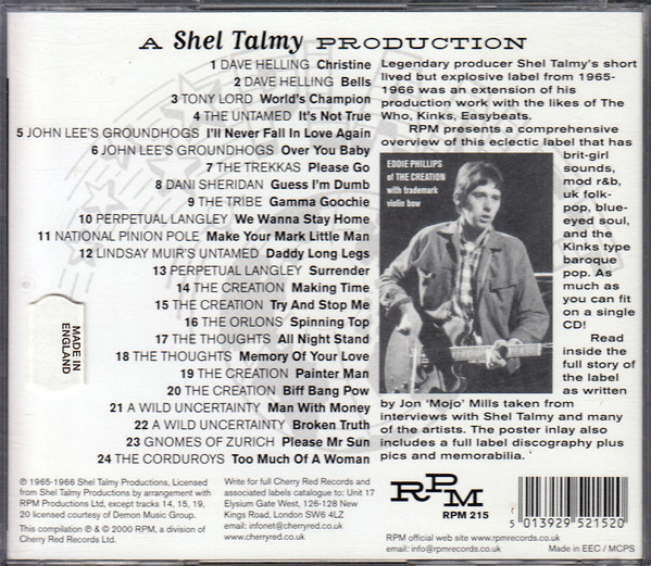 Записи групп, которые продюсировал Шел Талми в 1965-66 годы на своём лейбле Planet Records. Талми - американец из Чикаго, но прославился в Лондоне, где работал с группами The Who, The Kinks... На этой компиляции нет ни The Who, ни The Kinks. Зато есть The Creation и другие исполнители, которых Вы, может быть, не знаете. Знаете, как называют Shel Talmy? "Создателем гитарного рока"... И это правильно, потому что у него под крылом были Рэй Дэвис, Пит Тауншенд и... Джимми Пейдж. Не секрет ведь, что сессионный Джимми Пейдж играл на гитаре (иногда) вместо лидера The Kinks. И ещё - в 1962 году в Decca отвергли The Beatles, и Талми хотел их взять к себе. Но не получилось - Эпстайн увёл ребятишек...