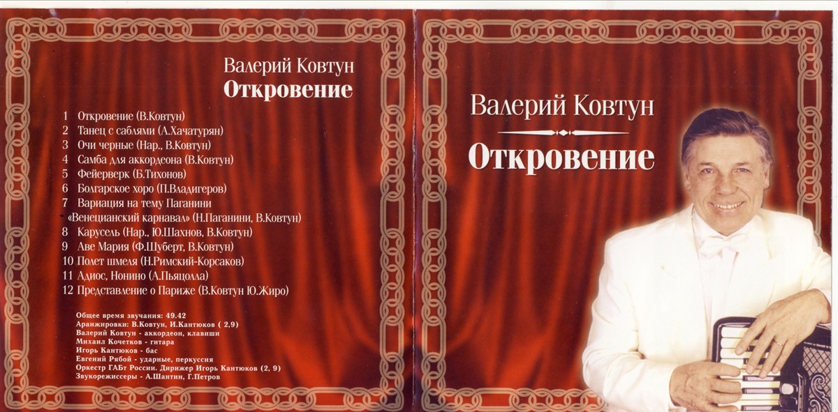 Валерий Ковтун родился в 1942 году в г.Керчь Крымской области. Отец - Ковтун Андрей Иванович (1915 г.рожд.), радиоинженер. Мать - Ковтун Тамара Лаврентьевна (1914 г.рожд.), по профессии - мастер. Валерий Ковтун вырос - у Черного моря, в краю "волнующей романтики, возвышенных мечтаний". Валере нравилось ходить к морю, смотреть на белые корабли. Он мечтал быть капитаном большого океанского лайнера. В их маленьком городке, как и во всем Советском Союзе, было тогда не мало праздников, когда люди надевали лучшие наряды и выходили гулять. В парках, на танцевальных площадках звучала музыка: "Рио Ритта", "Цветущий май", и королем музыки был баян. Мама решила отдать сына в музыкальную школу, накопила деньги и купила Валере баян. С инструментом паренек пришел в музыкальную школу, но там было много желающих учиться на баянистов и ему предложили поступить на курс аккордеона. Семилетний Валера простоял несколько часов у комиссионного магазина, надеясь, что кто-то принесет на продажу аккордеон. Ему повезло: на счастье одной супружеской паре нужен был баян, и они поменялись.Первым его педагогом был Григорий Гордеевич Чимирис. После окончания музыкальной школы, а затем музыкального училища, Валерий Ковтун служил в Советской Армии, в военно-духовом оркестре. Демобилизовавшись, молодой артист работал вместе с Махмудом Эсамбаевым, Иосифом Кобзоном, Юрием Богатиковым, в качестве солиста и музыкального руководителя. Имя Валерия Ковтуна стало известно во многих уголках нашей страны. Впоследствии он окончил Институт культуры (1991 г.), где получил специальность режиссера массовых представлений.Таланту Валерия Ковтуна можно позавидовать. С 1980 г. он создал инструментальный ансамбль, в составе которого в разные годы играли Иван Юрченко, Виталий Хренов и Евгений Рябой (ударные инструменты), Игорь Кантюков и Назыф Шайхлисламов (контрабас) и Михаил Кочетков (гитара). Творчество этого коллектива и его руководителя пользуется большой популярностью и признанием в России. Музыканты постоянно выступают с сольными концертами на телевидении и радио, принимают участие в телепрограммах и шоу.В репертуар квартета входят созданные Валерием Ковтуном обработки и аранжировки многих популярных классических и джазовых произведений отечественных и зарубежных авторов. Среди них: "Танец с саблями" (А.Хачатуряна), "Болгарское хоро" и "Домино" (П.Владигерова), "Чардаш" (В.Монти), "Сиртаки" (М.Теодоракис), "Кумпарсита" (Х.Матес Родригес), "Либер-Танго" (А.Пьяццолла), "Аве Мария" (Ф.Шуберт), "Венецианский карнавал" (Н.Паганини), "Полет шмеля" (Римский Корсаков), "Бесаме Мучо" (Гонсалес), "Цветущий май" (А.Полонский), "Брызги шампанского" и "Утомленное солнце" (Ю.Петербургский), "Ария" (И.Бах), "Любимый мой" (Дж.Гершвин), "Фернандес" (Д.Росс), "Адиос Нанино" (А.Пьяццолла), "Тико-шико" (Эбрю), "Карусель" (Ю.Шахнов), "Поссадобль" (А.Лепин), множество мелодий народов мира. Валерий Ковтун исполняет музыку и собственного сочинения. Многие его композиции вошли в репертуар известных русских и зарубежных аккордеонистов и эстрадных коллективов. Это: "Представление о Париже", "Молдавские наигрыши", "Посвящение L.M. (Вальс женщине)", "Карнавал на Кубе", "Женевский вальс", "Капризная женщина", "Откровение", многие другие. В.Ковтун написал музыку к мюзиклу "Доктор Живаго", который будет исполняться в Германии. Всего он сочинил более 50 мелодий.Пре