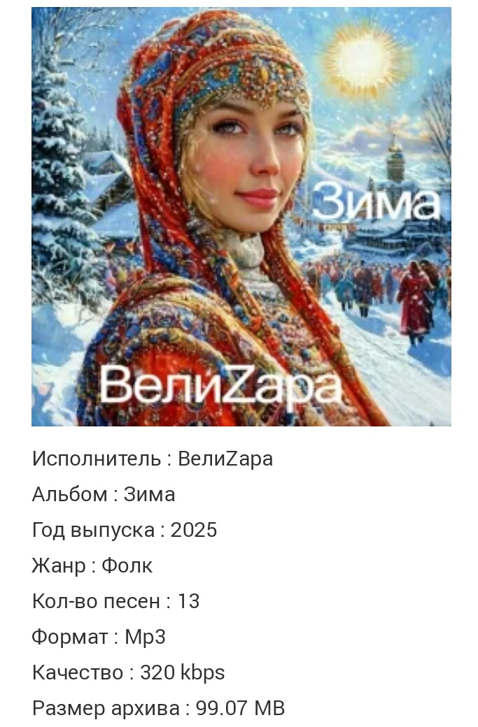 ВелиZара -автор-исполнитель, певица, поэтесса из г. Белгород. Творческое имя выбрано не просто так! Иностранных букв в нём нет!!! Z - это древнеславянская буквица "Земля" (Правильное написание можно увидеть на обложках ко всем песням). В каждой букве заложен смысл, который можно расшифровать, используя древнесловенскую буквицу. - сольная карьера началась в конце 2021г; - за это время выпущено более 70 треков (один из них саундтрек к историческому фильму), 3 музыкальных альбома, 1 альбом аудиостихотворений; - финалист Всероссийского фестиваля-конкурса "Стихопесня" поэтессы Любавы Трофимовой в номинации "Авторская песня" (г. Москва) первого сезона 2022-2023гг; -Финалист Международной премии эстрадной песни «Авторская песня года» Российского союза авторов-исполнителей 2022г; -лауреат международной литературно-музыкальной премии им. Булата Шалвовича Окуджавы "Давайте восклицать" Российского союза авторов исполнителей в номинации "Песня" 2023; - практикующий врач, владеющий восемью медицинскими специальностями.