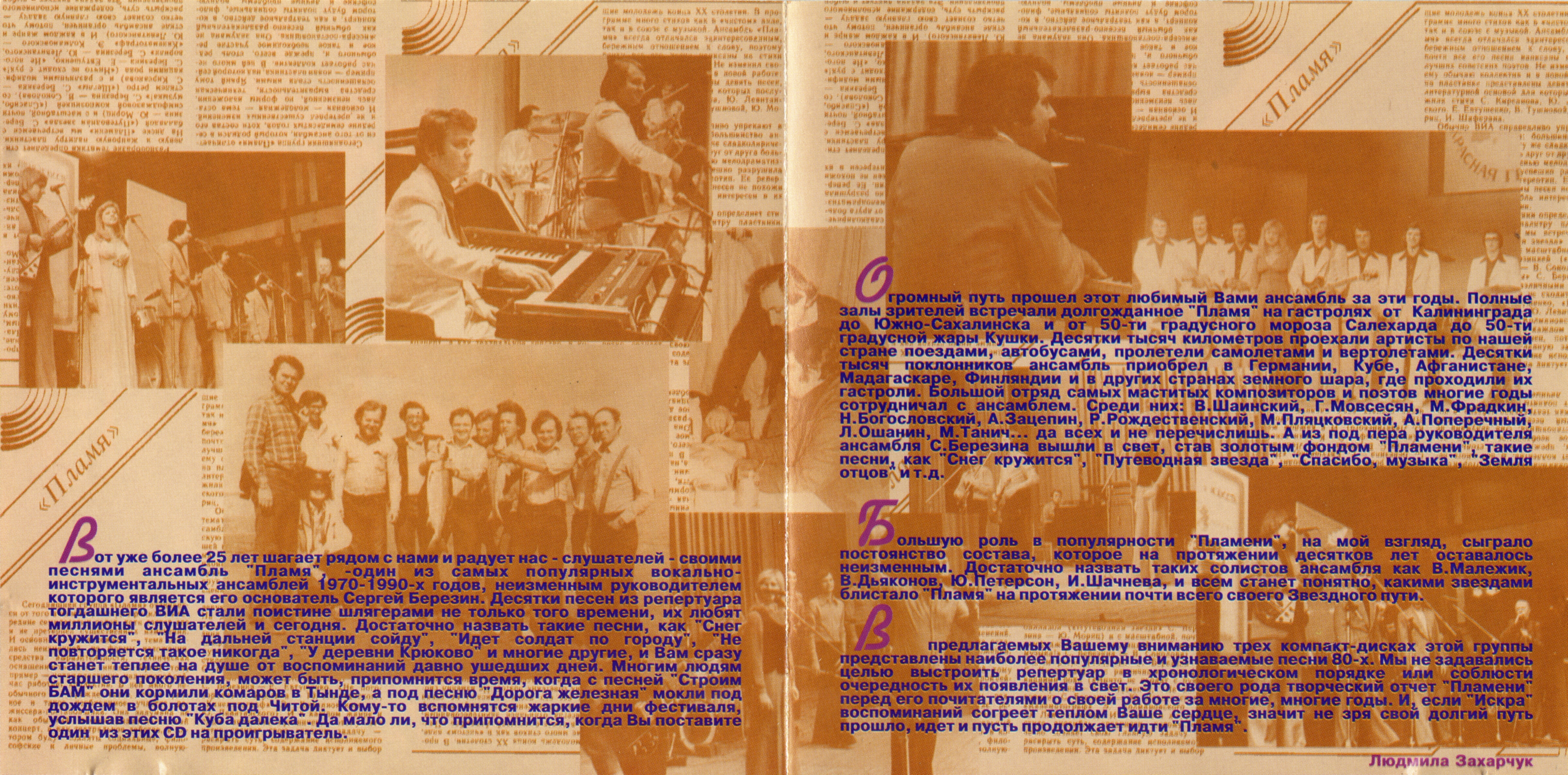 ► Вот уже более 25 лет шагает с нами и радует нас - слушателей - своими песнями ансамбль "Пламя", - один из самых популярных вокально-инструментальных ансамблей 1970-1990-х годов, неизменным руководителем которого является его основатель Сергей Березин. Десятки песен из репертуара тогдашнего ВИА стали поистине шлягерами не только того времени, их любят миллионы слушателей и сегодня. Достаточно назвать такие песни, как "Снег кружится", "На дальней станции сойду", "Идёт солдат по городу", "Не повторяется такое никогда", "У деревни Крюково" и многие другие, и Вам сразу станет теплее на душе от воспоминаний давно ушедших дней. Многим людям старшего поколения, может быть, припомнится время, когда с песней "Строим БАМ" они кормили комаров в Тынде, а под песню "Дорога железная" мокли под дождём в болотах под Читой. Кому-то вспомнятся жаркие дни фестиваля, услышав песню "Куба далека". Да мало ли, что припомнится, когда Вы поставите один из CD на проигрыватель.