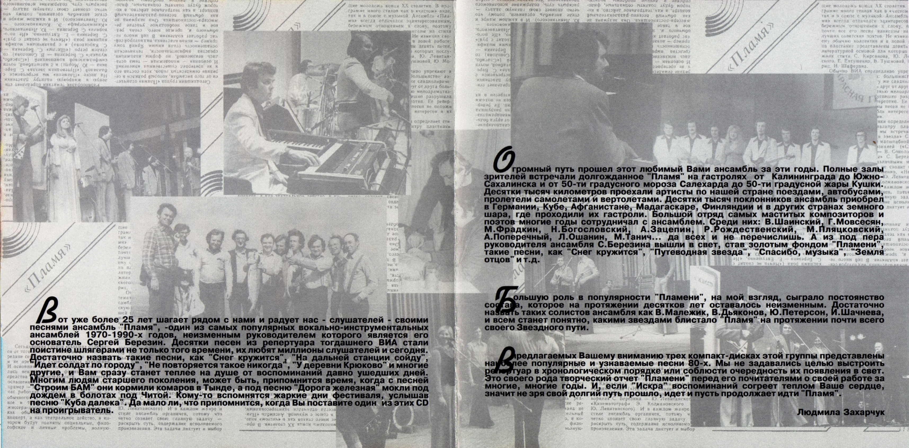 ► Вот уже более 25 лет шагает с нами и радует нас - слушателей - своими песнями ансамбль "Пламя", - один из самых популярных вокально-инструментальных ансамблей 1970-1990-х годов, неизменным руководителем которого является его основатель Сергей Березин. Десятки песен из репертуара тогдашнего ВИА стали поистине шлягерами не только того времени, их любят миллионы слушателей и сегодня. Достаточно назвать такие песни, как "Снег кружится", "На дальней станции сойду", "Идёт солдат по городу", "Не повторяется такое никогда", "У деревни Крюково" и многие другие, и Вам сразу станет теплее на душе от воспоминаний давно ушедших дней. Многим людям старшего поколения, может быть, припомнится время, когда с песней "Строим БАМ" они кормили комаров в Тынде, а под песню "Дорога железная" мокли под дождём в болотах под Читой. Кому-то вспомнятся жаркие дни фестиваля, услышав песню "Куба далека". Да мало ли, что припомнится, когда Вы поставите один из CD на проигрыватель.