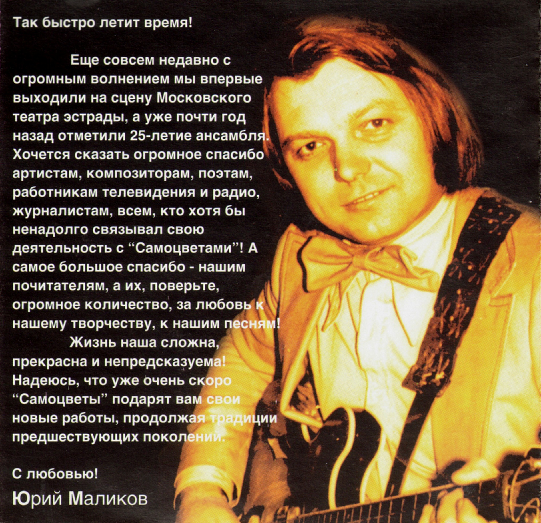 Ещё совсем недавно с огромным волнением мы впервые выходили на сцену Московского театра эстрады, а уже почти год назад отметили 25-летие ансамбля. Хочется сказать огромное спасибо артистам, композиторам, поэтам, работникам телевидения и радио, журналистам, всем, кто хотя бы ненадолго связывал свою деятельность с “Самоцветами”! А самое большое спасибо - нашим почитателям, а их, поверьте, огромное количество, за любовь нашему творчеству, к нашим песням!
