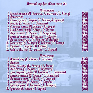 Вашему вниманию представлена концертная программа «Марафон и видеотека» вокально-инструментального ансамбля «Синяя птица», которая была посвящена десятилетнему юбилею ансамбля и проходила во многих городах Советского Союза на протяжении всего 1986 года. Концертный тур не мог пройти мимо родного города. В октябре группа дала несколько концертов в Гомельском Дворце культуры железнодорожников им.Ленина, на одном из которых их первым звукорежиссёром Алексеем Куликом и была произведена данная запись.