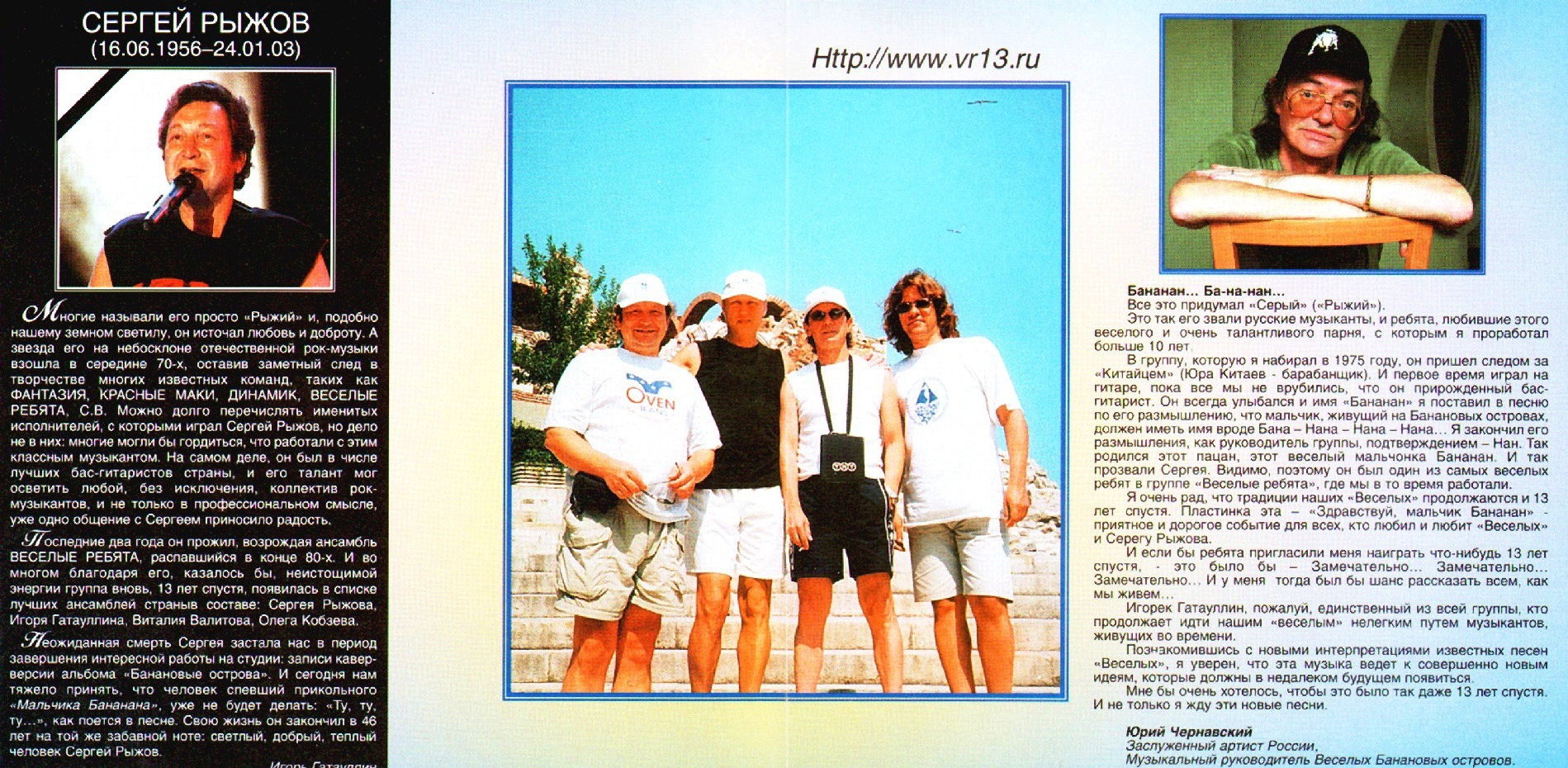 Неожиданная смерть Сергея застала нас в период завершения интересной работы на студии: записи кавер-версии альбома «Банановые острова». И сегодня нам тяжело принять, что человек, спевший прикольного «Мальчика Бананана», уже не будет делать «Ту, ту, ту...», как поётся в песне. Свою жизнь он закончил в 46 лет на той же забавной ноте: светлый, добрый, тёплый человек Сергей Рыжов.