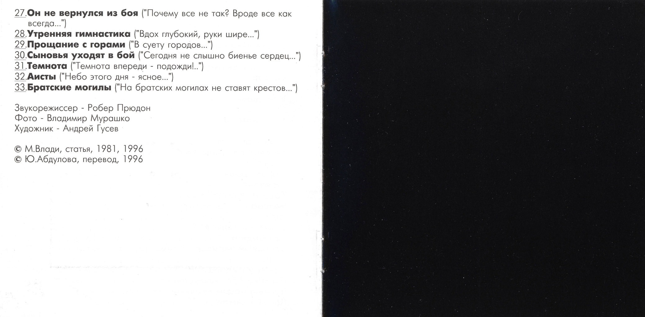 ► 22 вошли в двойной виниловый альбом (1981г.) и компакт-диск Le Vol Arrete (Le Chant du Monde LDX 74762/63 и Le Chant du Monde LDX 274 762).