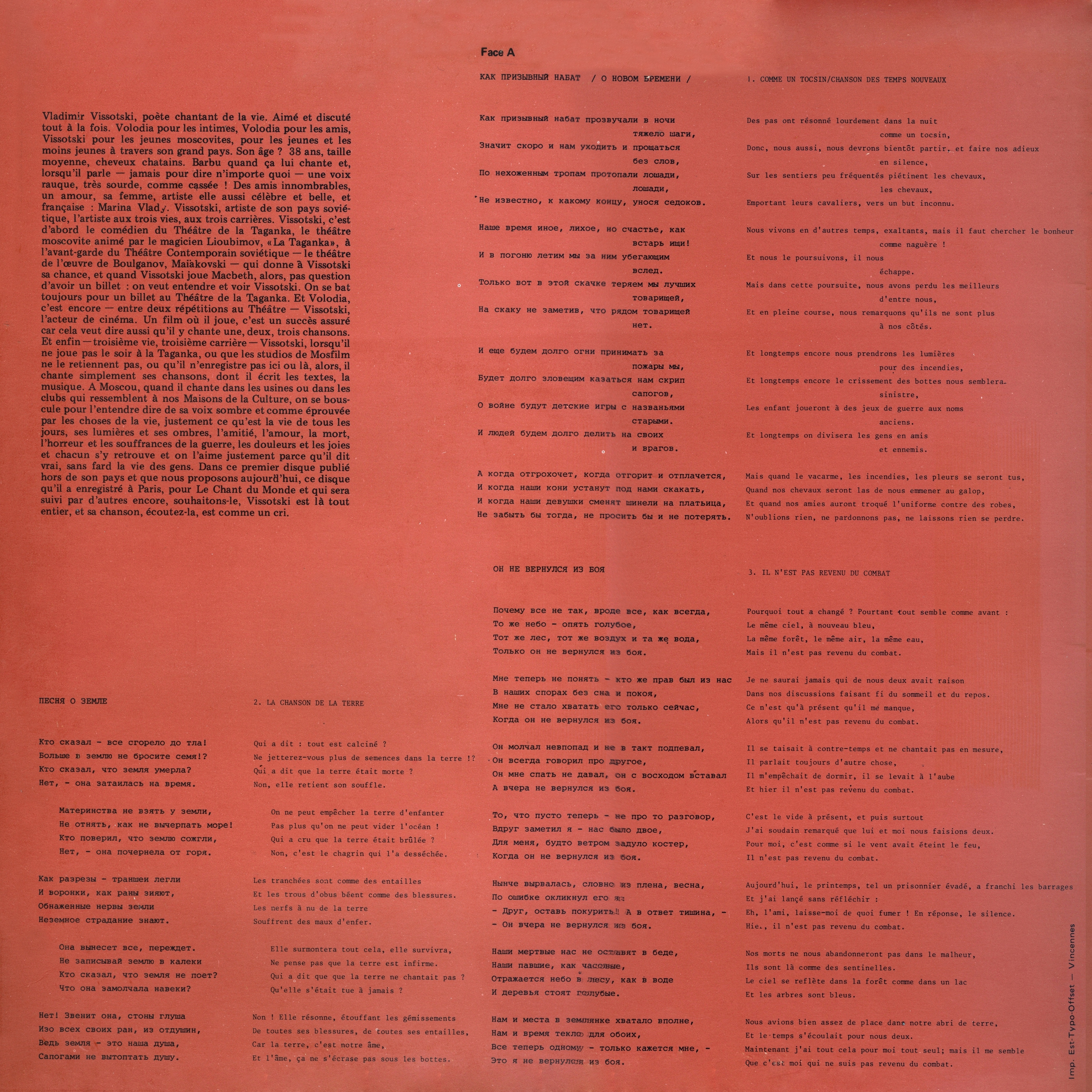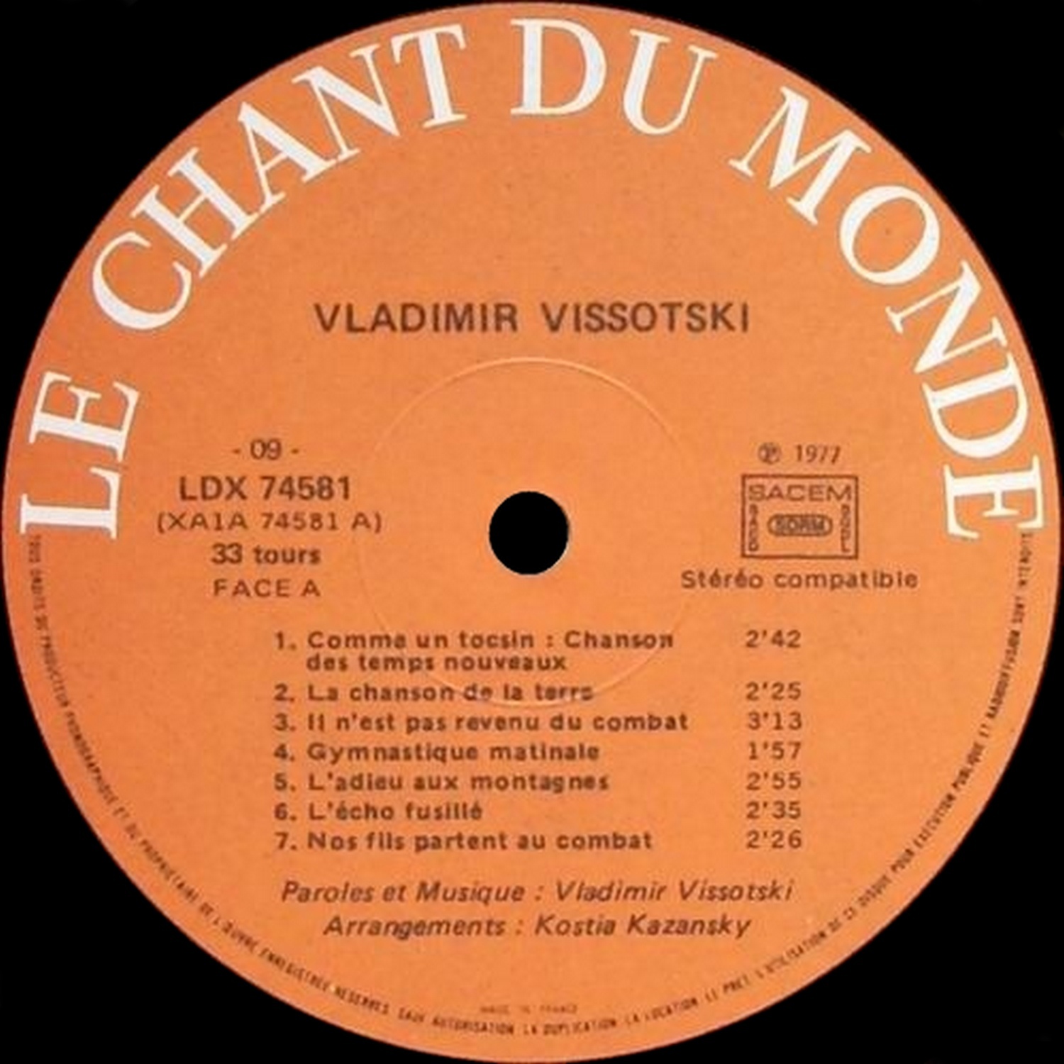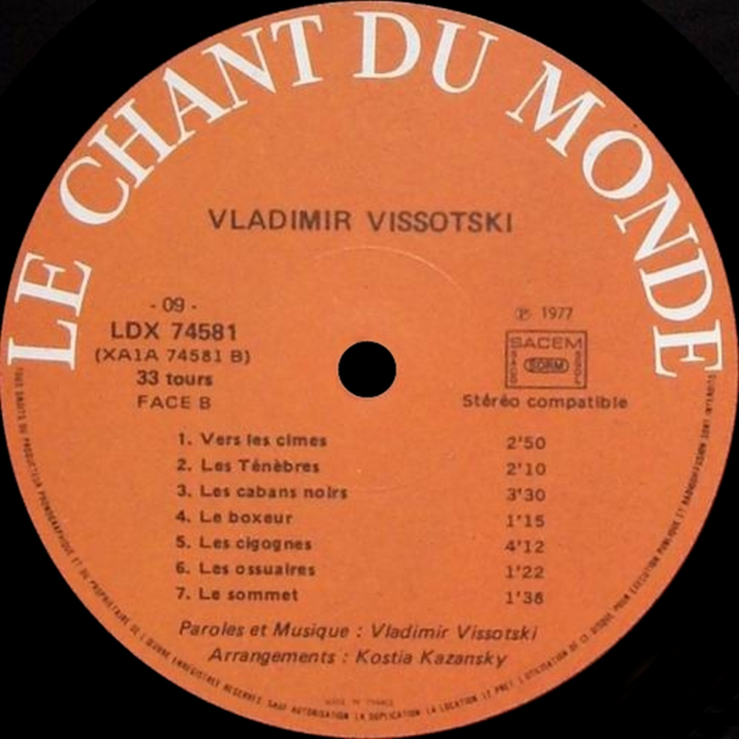 В результате, весной 1977 вышла его первая пластинка во Франции - Vladimir Vissotski. Её часто называют "Le nouveau chansonnier international U.R.S.S." по мелкой надписи в левом верхнем углу, но это неверно, потому что у Le Chant Du Monde выходила целая серия пластинок под названием "Le nouveau chansonnier international" - "Новый международный шансонье", в которой издавались певцы-композиторы из разных стран.