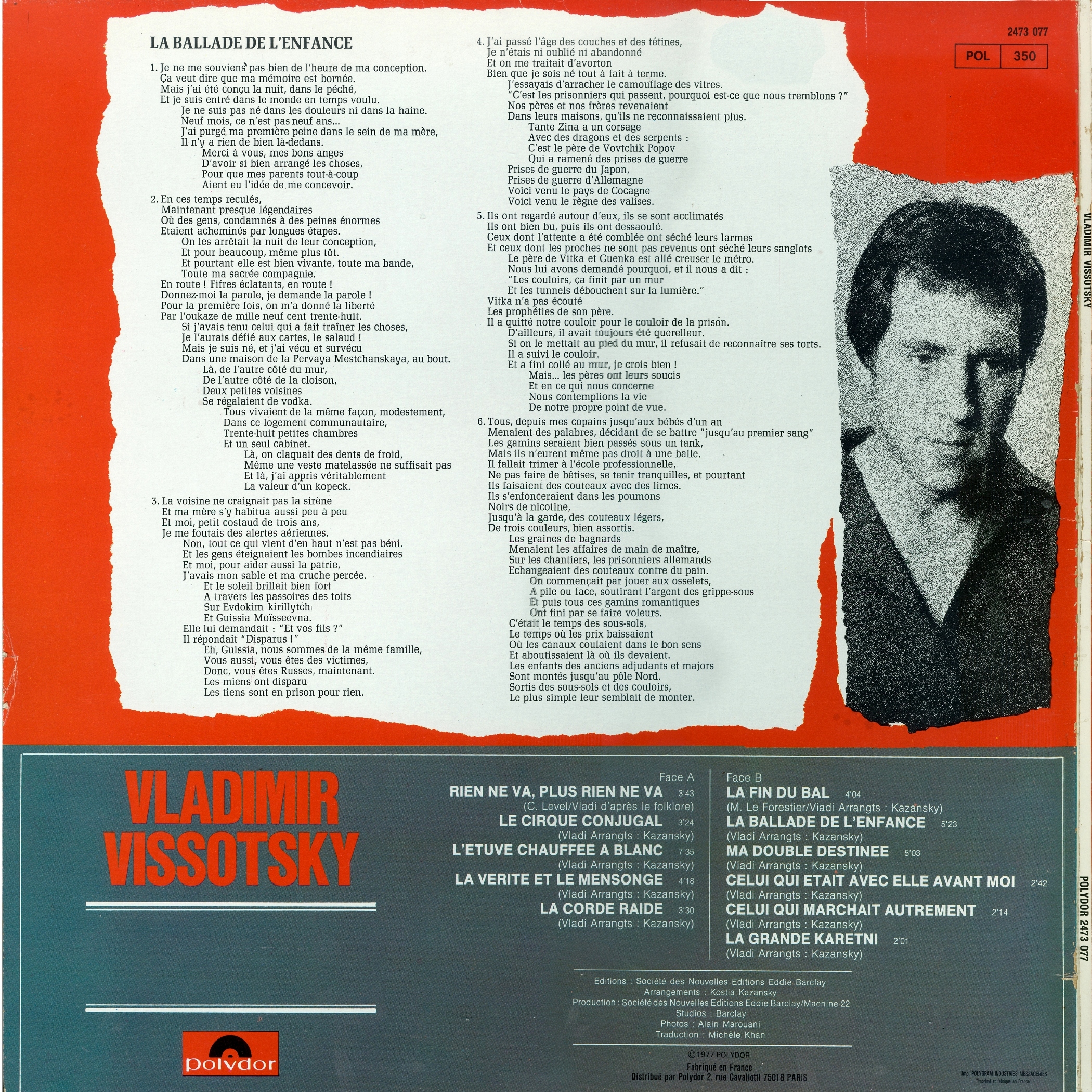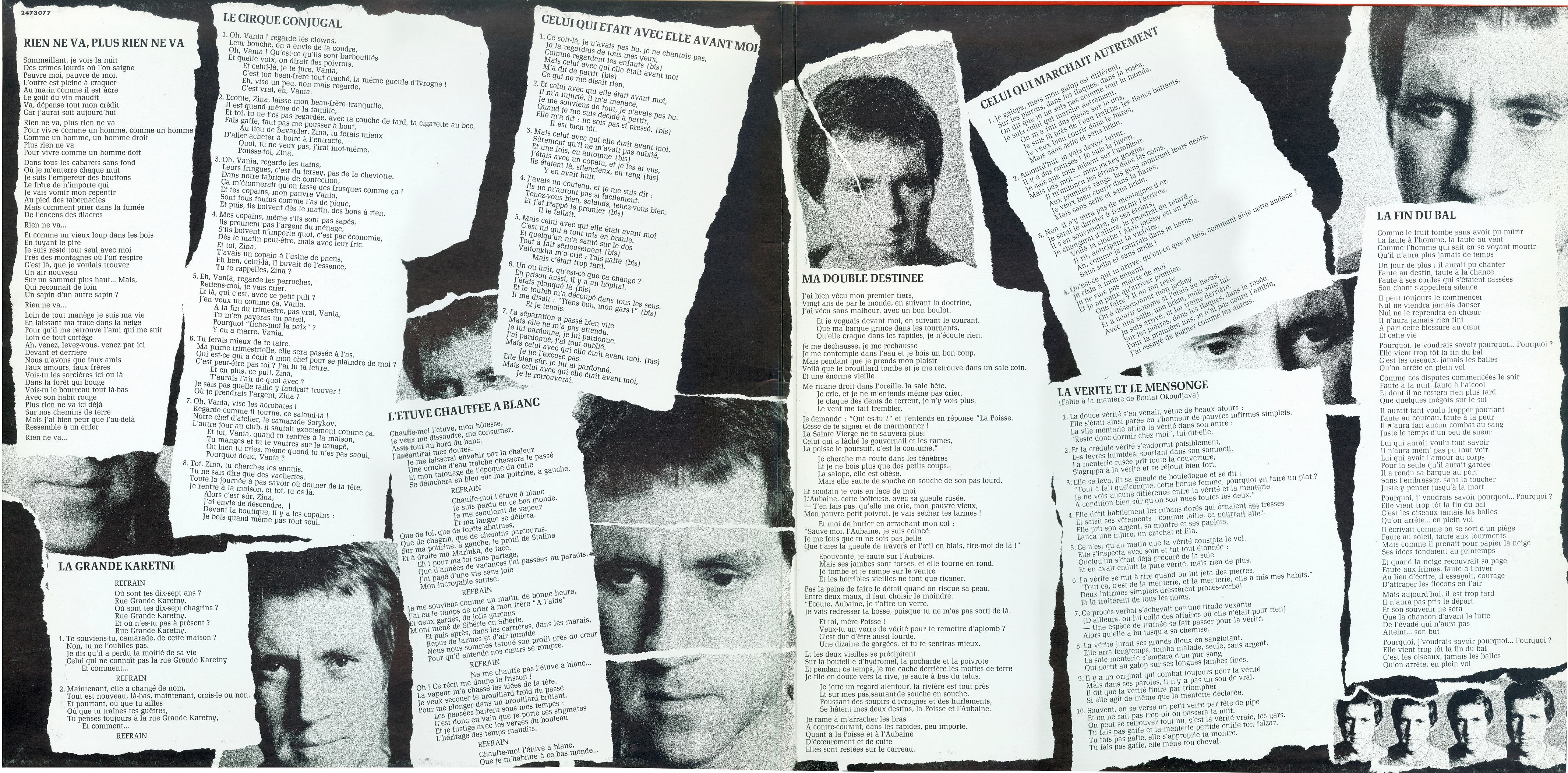 Перевод двух песен на французский язык осуществили Кристоф Лаваль при участии Марины Влади (Rien ne va, plus rien ne va) и Максим ле Форестье (La fin du bal), также при участии Марины (я полагаю, что она делала для обоих поэтов французские подстрочники). На конверте размещены тексты песен в переводе ле Форестье на французский язык.