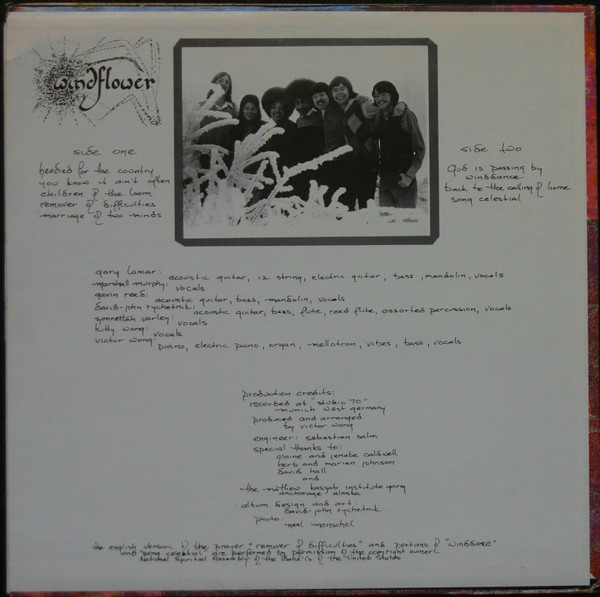 Вот что пишет участник группы Gavin Reed: "This band formed in Alaska in late 1972. All members belonged to the Baha'i Faith and many of the gigs the group played were associated with Baha'i community events... Windflower recorded and released one album of original material in 1973 at Studio 70 in Munich, West Germany, during a European tour (also associated primarily with Baha'i events at the time) which included performances in Germany, England, Austria, Lichtenstein, Switzerland, Israel, Norway and Finland. The album was privately pressed and released in early 1974. Prior to returning to Alaska and retiring from professional music, the group also performed at various venues in Oklahoma, Hawaii. Band members including Gary Lamar, Marshall Murphy, and Gavin Reed, along with vocalist Barbara Taylor, performed casual gigs for a number of years, based out of Anchorage, Alaska, while they were all resident there, until the mid-1990's". Послушаем алеутов...